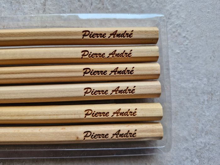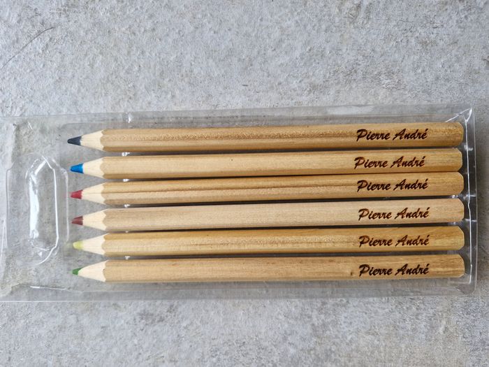 Lot de 6 crayons de coloriage en bois Longueur : 18 cm Diamètre : 1 cm Personnalisés avec le prénom Pierre André Etui non disponible