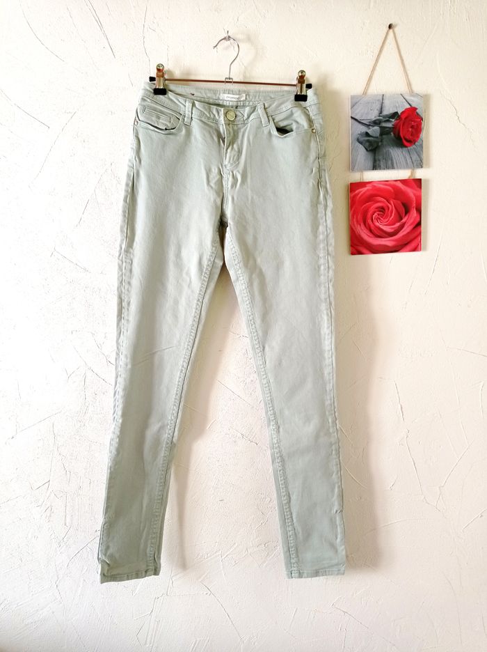 Joli jean vert d'eau clair un peu délavé, plutôt taille basse, 2 poches à l'avant + 2 à l'arrière. Très bon état général. Largeur à plat à la taille : 34 cm, longueur à partir de l'entrejambe : 76cm. Longueur totale : 96cm. Largeur à plat du bas des jambes : 12.5cm. Assez extensible. #frip_femme36