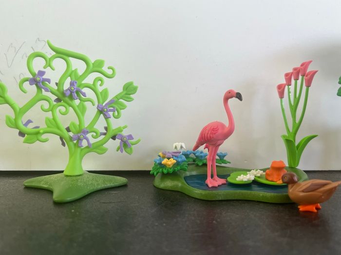 2 cerfs, 2 biches, 2 faons 1 personnage 1 étang avec un canard, une grenouille et un Flament rose Des plantes