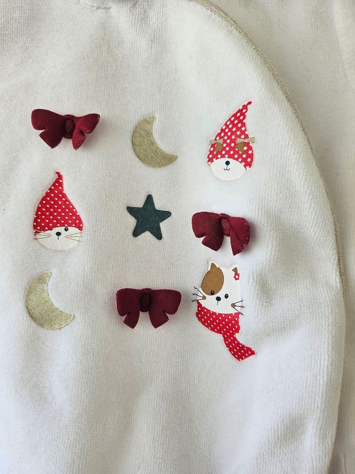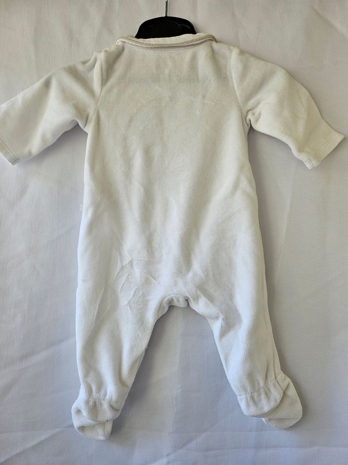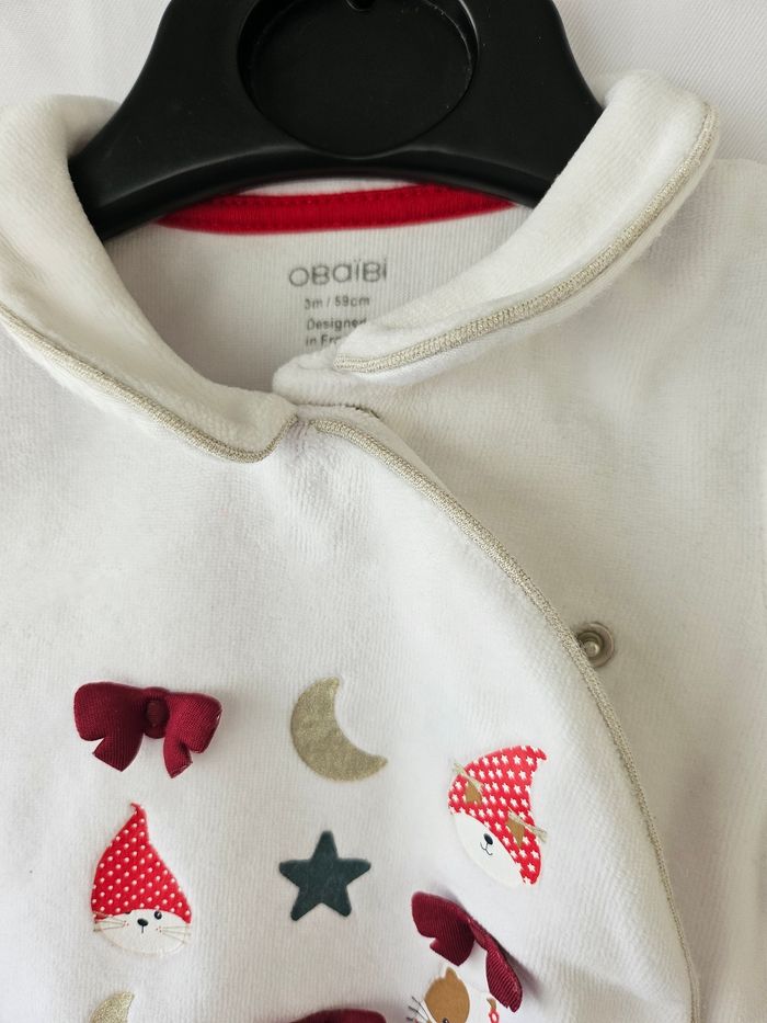 Pyjama en velours blanc avec imprimés et 3 nœuds devant. Liseré argenté au niveau du col. Ouverture par pressions sur le devant. Marque : Obaibi Taille : 3 mois