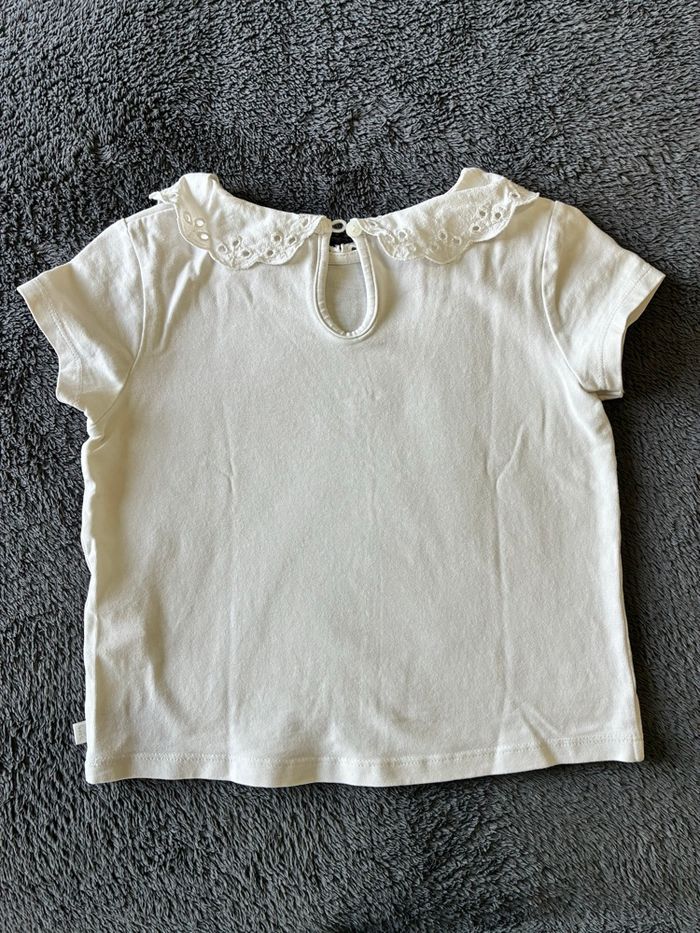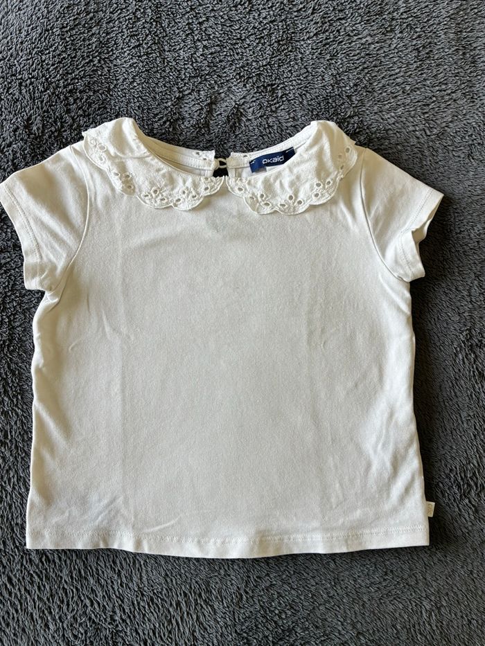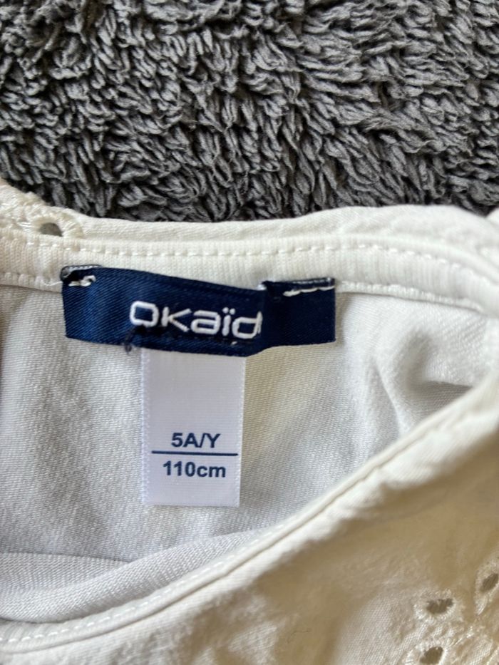 🌸 T-shirt Marque Okaïdi Taille 5 ans Blanc Très bon état (une micro tache, voir photo) 💡 N’hésitez pas à composer un lot avec d’autres articles de mon dressing afin d’activer les réductions 😉