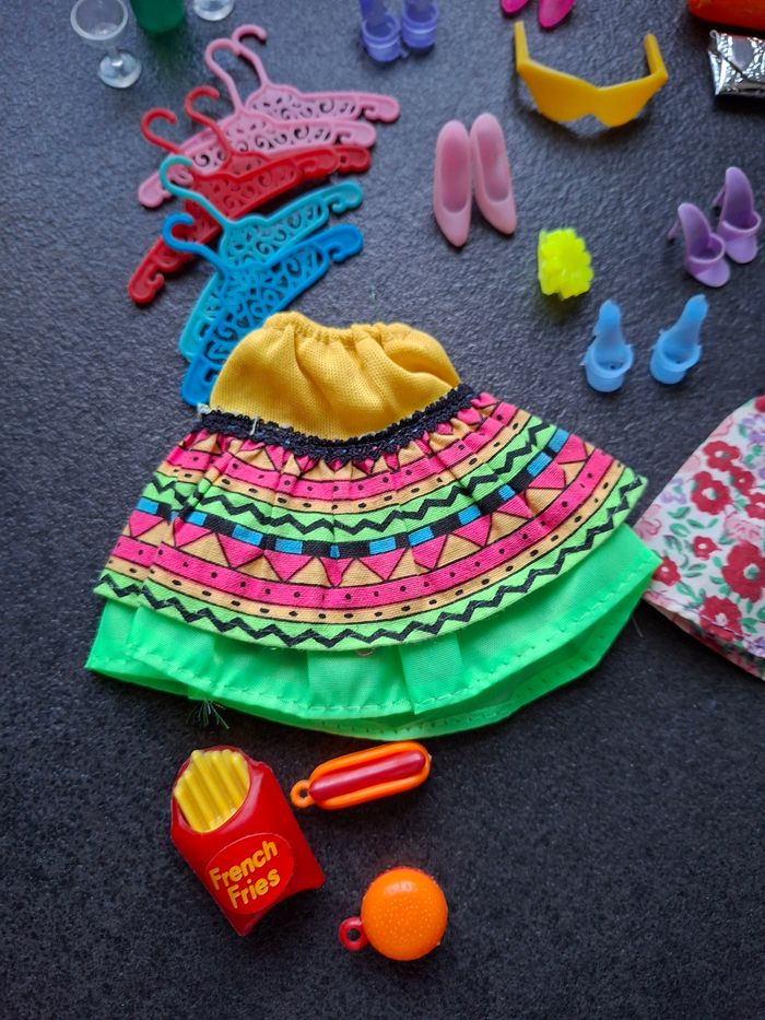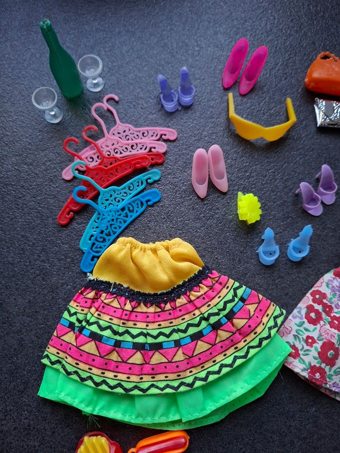 Je vends un lot de 29 accessoires/ tenues pour poupée BARBIE. Ce lot se compose de : 1 paire escarpin ouvert violet clair 1 paire escarpin ouvert violet foncé 1 paire d'escarpin ouvert bleu 1 paire d'escarpin fermé rose 1 paire d'escarpin fermé rose pâle 1 chapeau rose 2 sacs à mains (argent et orange) 1 paire de lunettes jaune 1 paire de jumelles 1 barette jaune 3 bigoudis 6 cintres pour suspendre les vêtements 2 verres sur pieds 1 bouteille 1 hot-dog 1 burger 1 petite frite 2 jupes 1 combinaison, attache un peu effilochée Prix du lot : 10 €