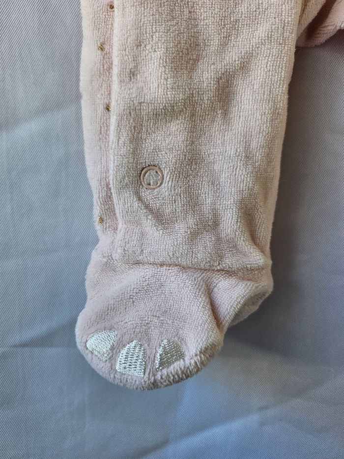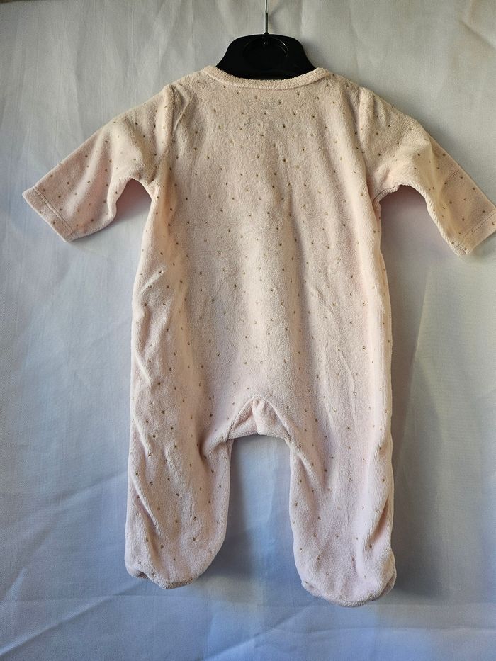 Pyjama en velours rose pâle et points dorés avec broderies devant. Ouverture devant par pressions. Marque : Gemo Taille : 3 mois