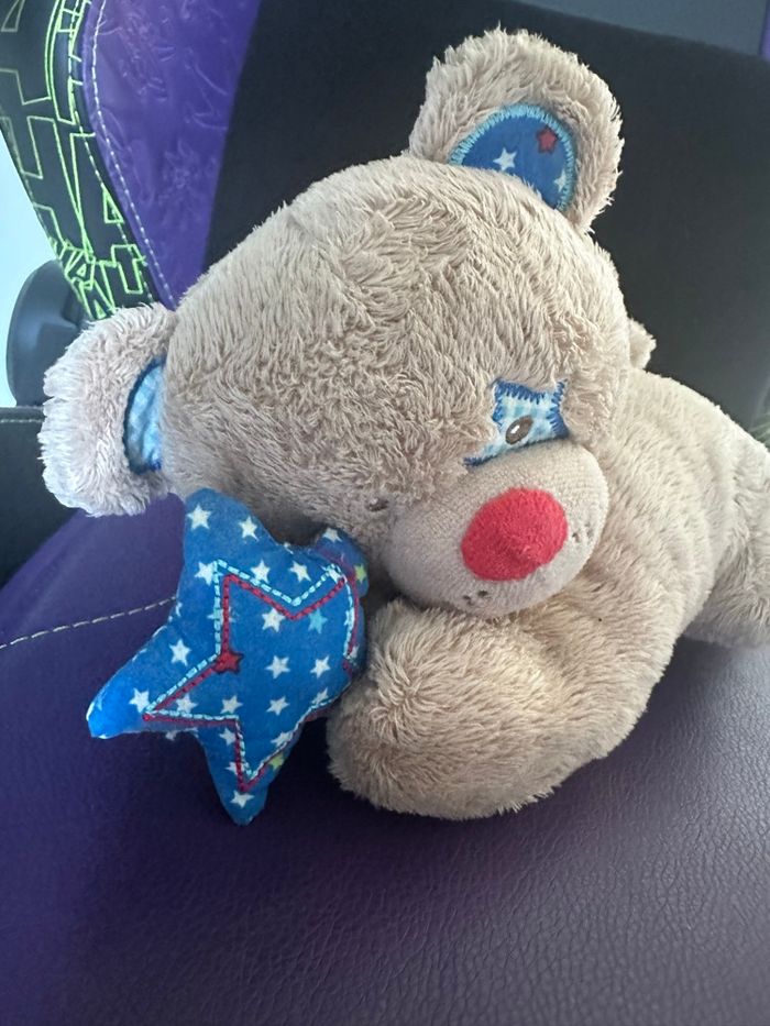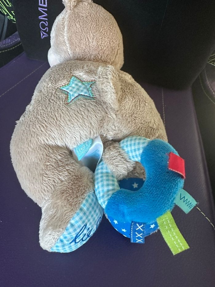 Ourson tout doux et rigolo avec les couleurs et quand on tire sur le rond il fait de la musique