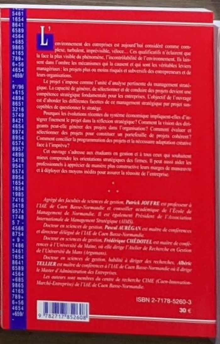bonjour vends ce livre "Le management stratégique par le projet", auteurs : Patrick Joffre, Pascal Aurégan, Frédérique Chédotel, Albéric Tellier Editeur : Economica idéal pour étudiant en Gestion de projet, formateur/enseignant ou chef de projet ISBN : 9782717852608 État neuf prix 10€ (envoi rapide et soigné) L'environnement des entreprises est aujourd'hui considéré comme complexe, turbulent, imprévisible, véloce... Ces qualificatifs n'éclairent que la face la plus visible du phénomène, l'incontrôlabilité de l'environnement. Ils laissent dans l'ombre les mécanismes qui la causent et qui sont les véritables leviers managériaux : les projets plus ou moins risqués et subversifs des entrepreneurs et de leurs organisations. Le projet s'impose comme l'unité d'analyse pertinente du management stratégique. La capacité de générer, de sélectionner et de conduire des projets devient une compétence stratégique fondamentale pour les entreprises. L'objectif de l'ouvrage est d'aborder les différentes facettes de ce management stratégique par projet susceptibles de questionner le stratège. Pourquoi les évolutions récentes du système économique impliquent-elles d'intégrer finement le projet dans la réflexion stratégique ? Comment la vision des dirigeants peut-elle générer des projets dans l'organisation ? Comment évaluer et sélectionner des projets pour constituer un portefeuille de projets cohérent ? Comment concilier la programmation des projets et la nécessaire adaptation créative face à l'imprévu ? Cet ouvrage s'adresse aux étudiants en gestion et à tous ceux qui souhaitent mieux comprendre les orientations stratégiques des firmes. Il peut aussi aider les professionnels à apprécier de manière plus constructive leurs marges de manœuvre et à déployer des moyens inédits pour assurer la réussite de l'entreprise.