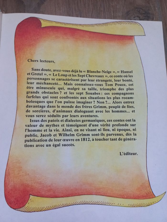 Livre : les plus beaux contes de GRIMM. La tranche du livre, en haut et bas et légèrement renfoncée. Voir photos. Le livre n'est pas abîmé, aucune page manquante. La couverture est un peu passée dû au jour. Prix : 7€