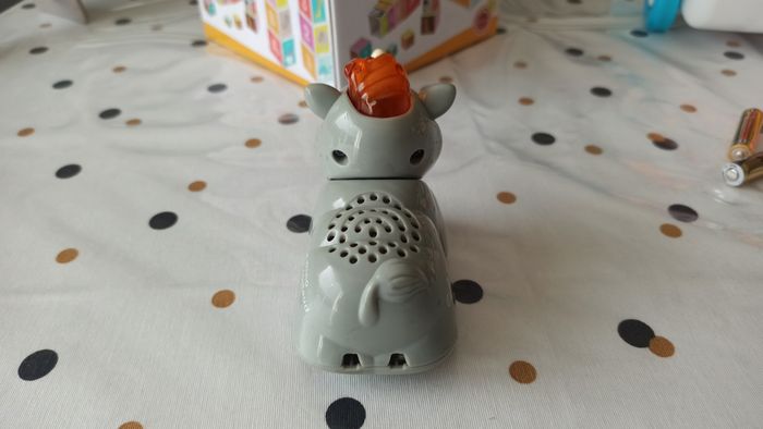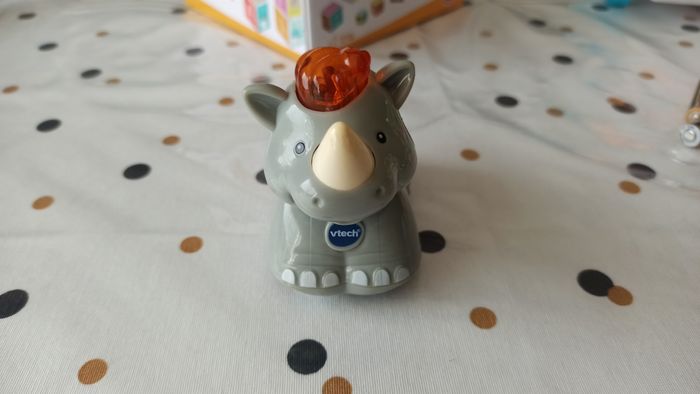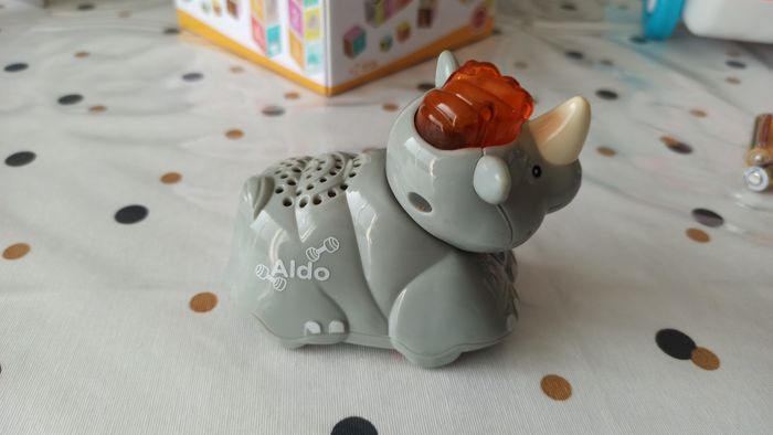 Tut Tut animo Aldo le rhinocéros. Parlant, musical et lumineux. Fonctionne avec 2 piles LR3 (non fournies)