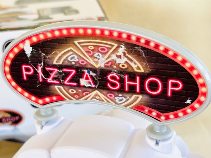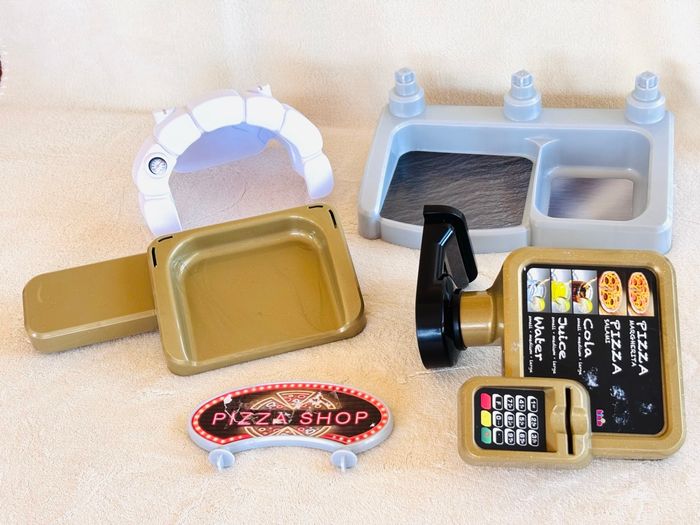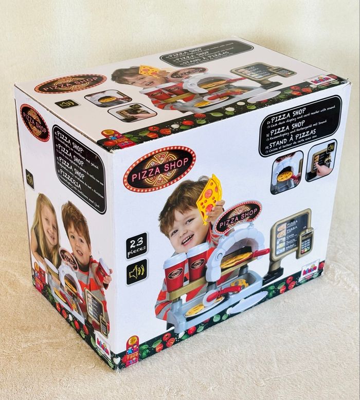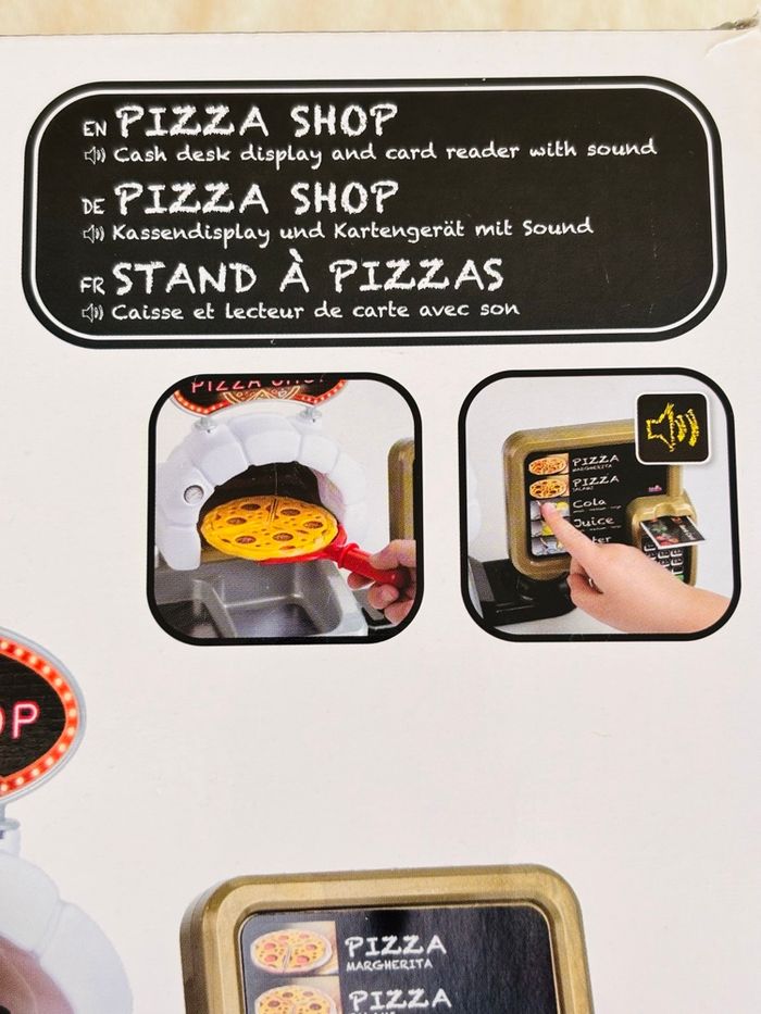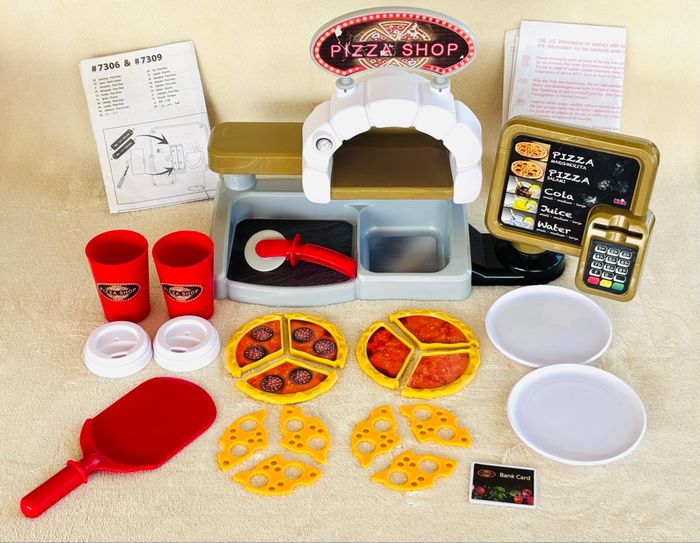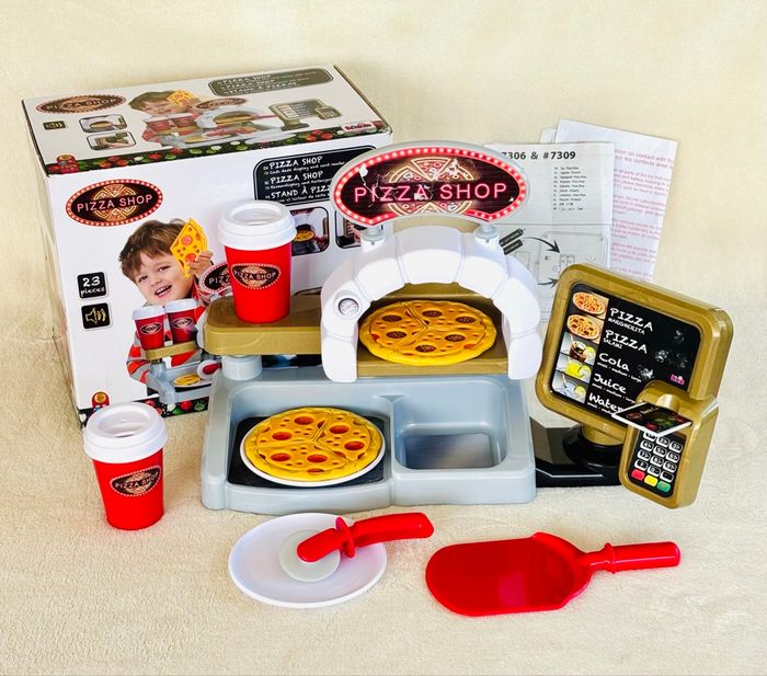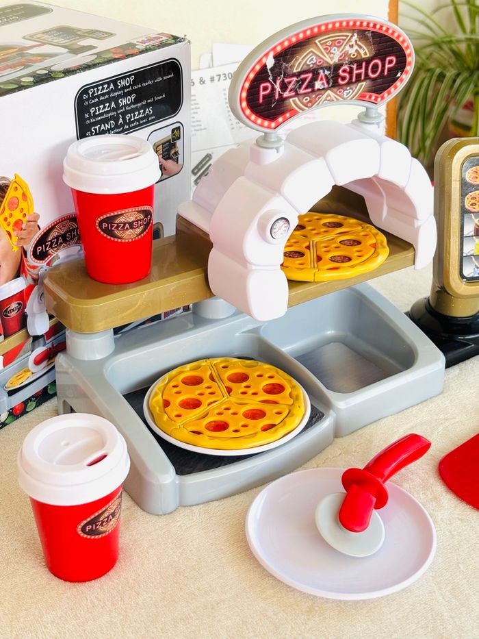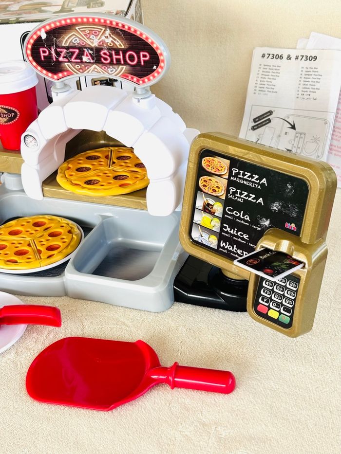 Jouet Pizza Shop avec pizzas à garnir Klein +3ans Terminal de paiement avec fonction sonore au moment de l'insertion de la carte bancaire. Partie dédiée à la préparation des pizzas avec four, bac à ingrédients et présentoir. Ecran de commande avec touches sonores En plastique. Enfants à partir de 18 mois - Pelle à pizza - Roulette à pizza - 2 gobelets avec couvercles - 2 pizzas réversibles (12 pièces) - 2 assiettes blanches - 1 carte bancaire - Notice Marque : Klein *Traces d'usure. *Sticker du panneau PizzaShop déchiré et l’écran de commande abimé avec des autres stickers ⛔️ Prix FIXES, NON négociables 🚨  👏🏻 Réductions sur les lots 👍🏻 #pizza #dinette #klein