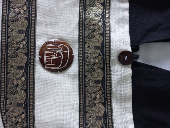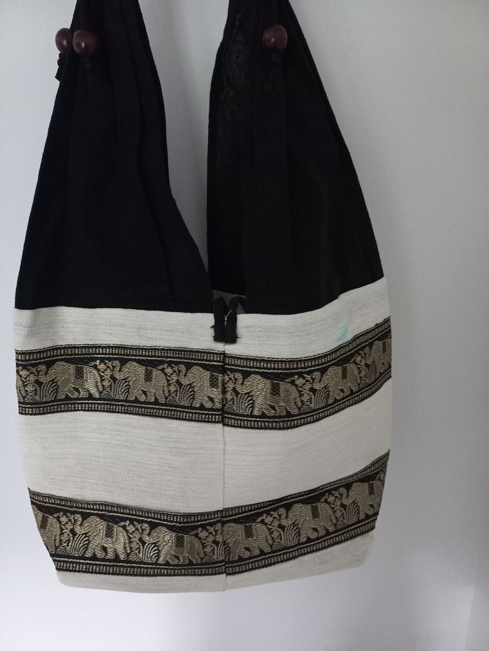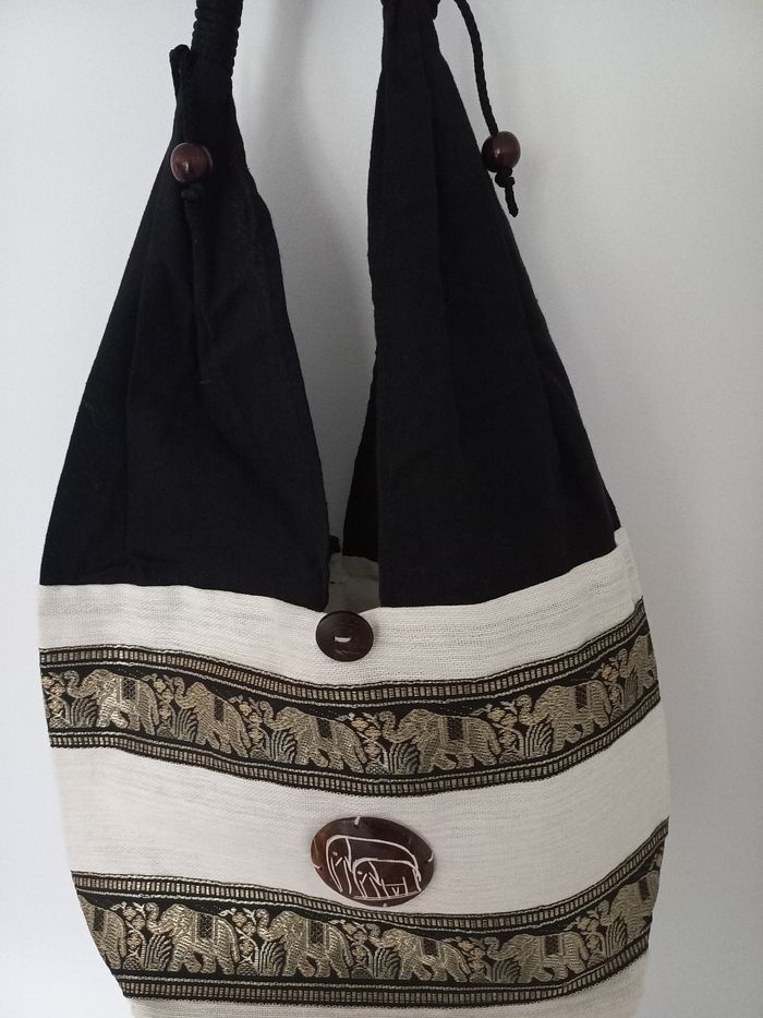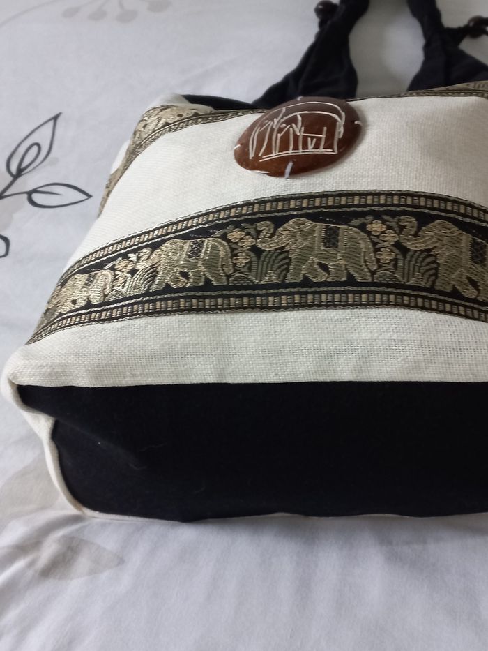 Je vends un sac à main neuf. Motif éléphants. Coloris : beige / noir/ or. Grande ouverture, fermeture par un bouton. Un défaut à l'arrière qui est dans le tissu. C'est une tâche verte. Voir photo. Dimensions environs : 30cm de long , hauteur 25 cm c'est la partie beige, je n'ai pas pris e compte les anses noires. Prix : 7€ . D'autre sac dispo sur mon profil