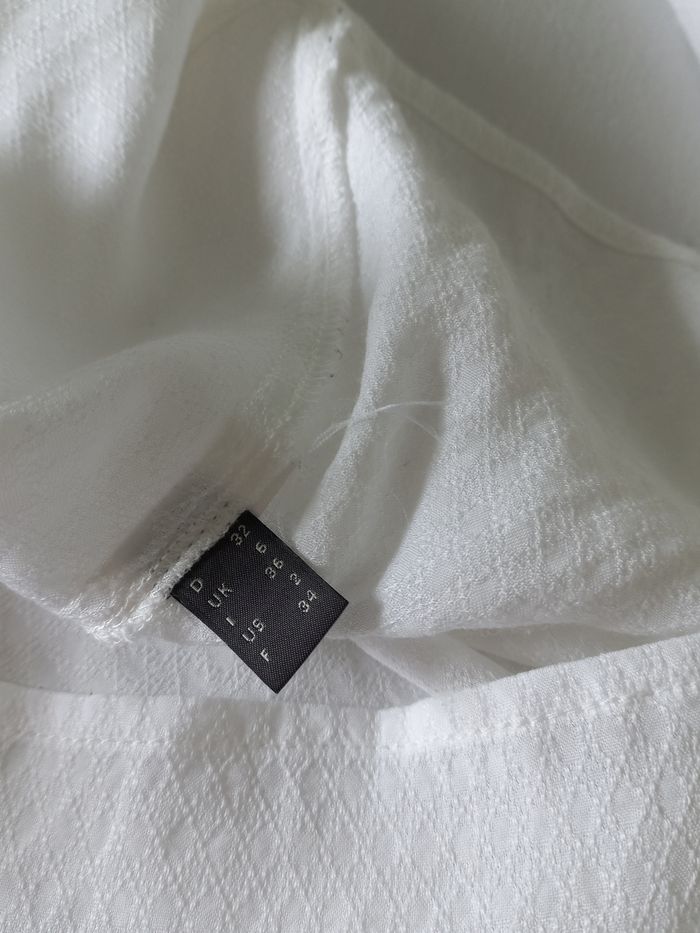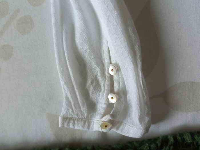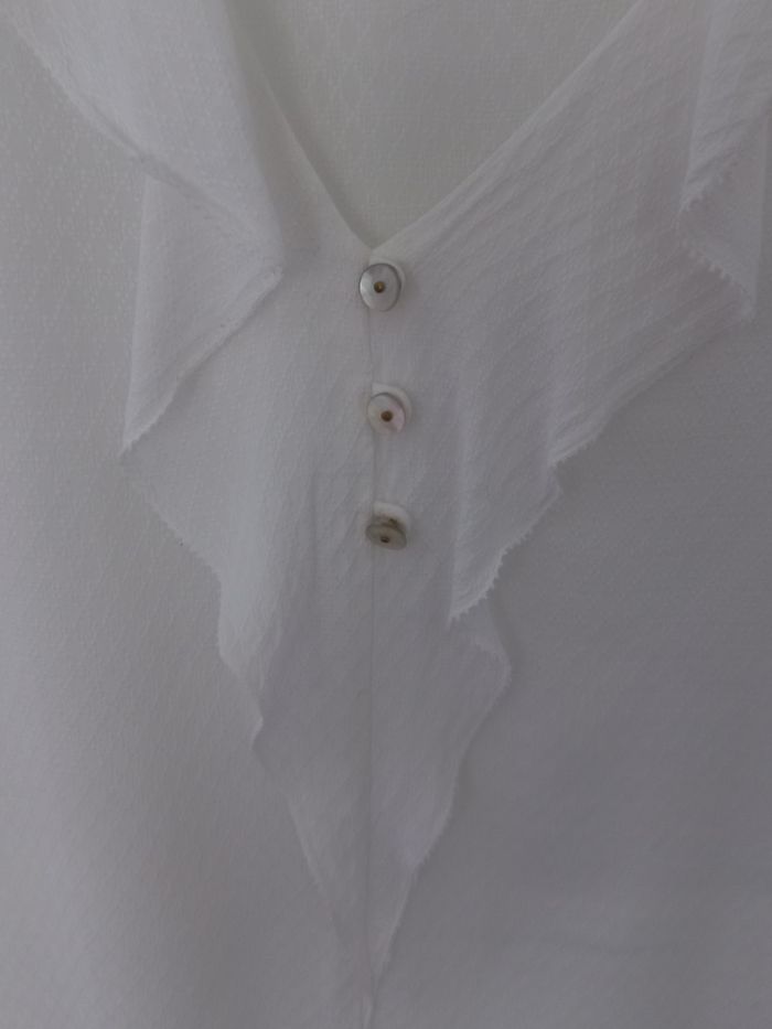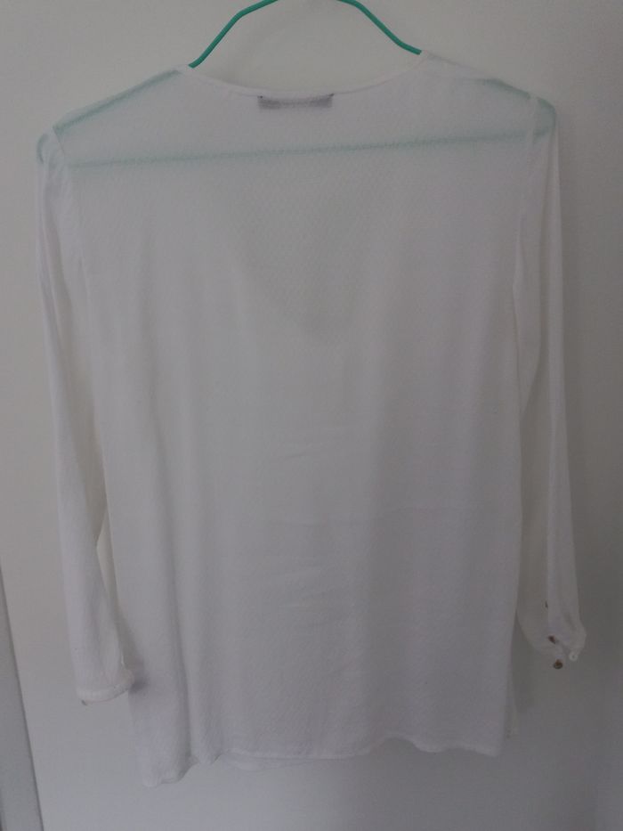 Je vends une blouse blanche Esprit, taille 34. 3 boutons aux bas des manches de chaque côté. Manches 3/4 Col V avec 3 boutons nacrés. Pas de reprise si taille ne va pas. Prix : 5€