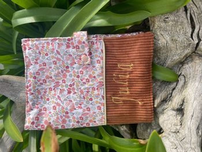 Protège carnet de santé en velours/gaze de coton . Taille standard. Choix des tissus disponibles sur demande. Broderie du prénom comprise ⚠️ m’interroger avant de valider l’achat