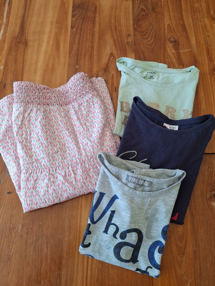 Ce lot comprend : - 1 jupe neuve sans étiquette - 3 tee-shirts Taille 6 ans Différentes marques OKAIDI, TAO..