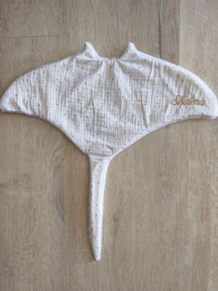 ✨ Doudou Raie Manta personnalisé ✨ Un véritable cocon de douceur pour bébé 💛 Ce magnifique doudou en forme de raie manta est confectionné en double gaze, une matière légère, respirante et ultra douce, idéale pour la peau délicate des tout-petits. 🌟 Son petit plus ? De délicats points dorés qui apportent une touche chic et raffinée, ainsi qu’une personnalisation brodée au prénom pour un doudou unique et rempli d’amour. 🤍 Dos en tissu tout doux pour encore plus de confort et de tendresse. 🎨 Disponible en plusieurs coloris pour s’adapter à tous les univers bébé. 💫 Parfait comme cadeau de naissance ou pour accompagner bébé au quotidien. 💰 Prix : 25€ 📩 Personnalisation sur commande – prénom au choix