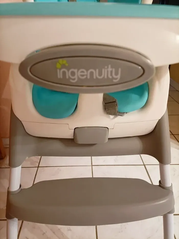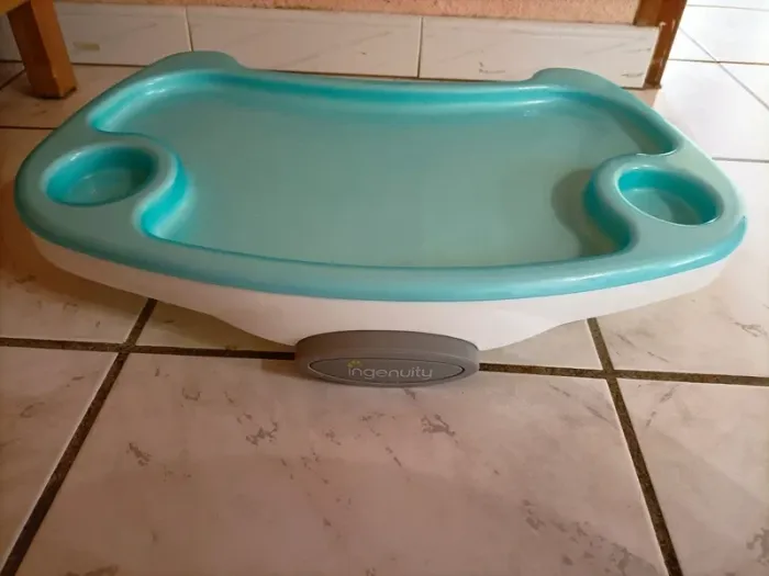 Vends notre chaise haute 3-en-1 de la marque Ingenuity, achetée chez Toys "R" Us. C'est un modèle reconnu pour sa grande robustesse et sa stabilité. Matériaux de qualité : Structure en fer (très stable). Assise en plastique épais et résistant. Un modèle 3-en-1 très pratique : Chaise haute complète pour les repas de bébé. Rehausseur pour s'installer à table avec les grands (se fixe sur une chaise standard). Petit fauteuil enfant sur pieds ou roulettes. Accessoires inclus : Double tablette amovible (blanche + sur-tablette turquoise transparente). Pieds fixes + pieds avec roulettes (système de freins). Harnais de sécurité complet. État : Bon état général La chaise est très propre et parfaitement fonctionnelle. Je signale simplement par souci de transparence deux points esthétiques : Assise : Une marque de chauffe superficielle sur le plastique gris (due à une ampoule posée par mégarde). Ce n'est pas percé, la solidité est intacte et c'est invisible une fois l'insert turquoise mis en place. Pieds : Quelques éclats de peinture sur la partie en fer (voir photos). Une super affaire pour une chaise complète et évolutive qui durera encore longtemps !