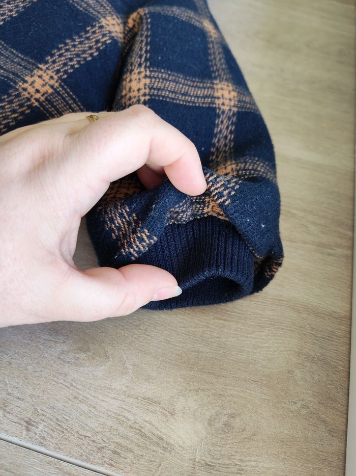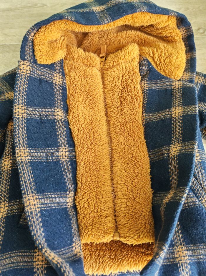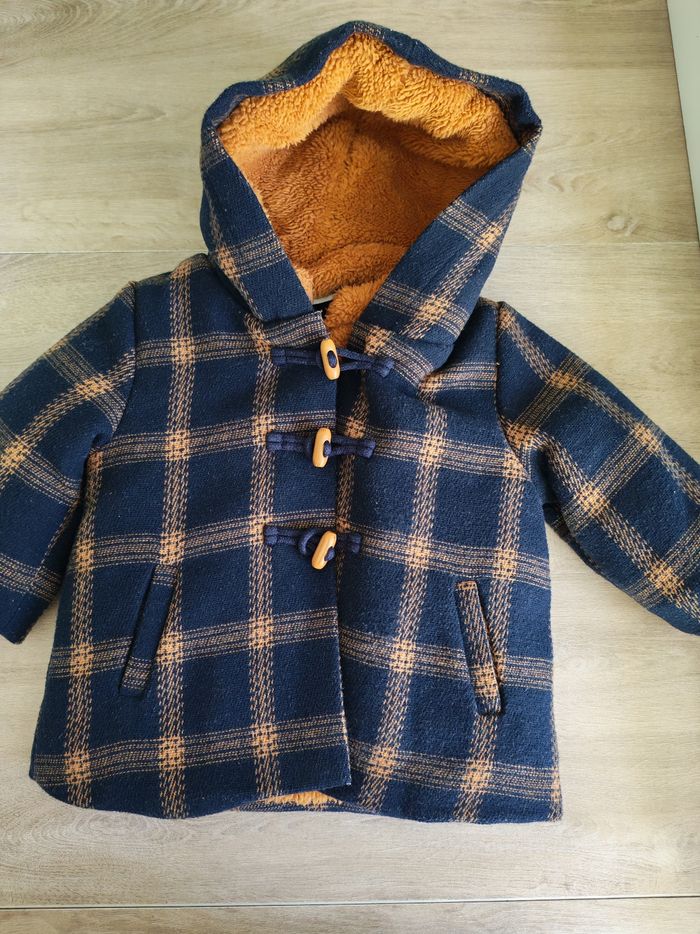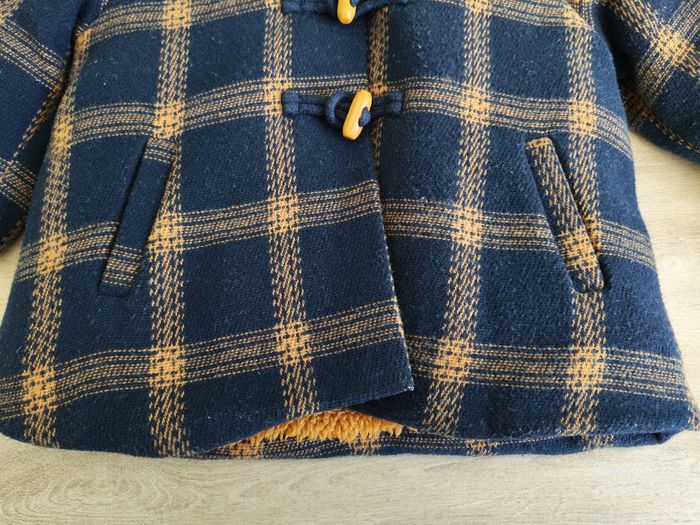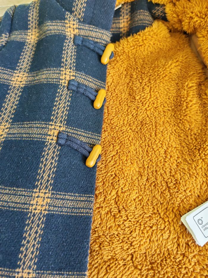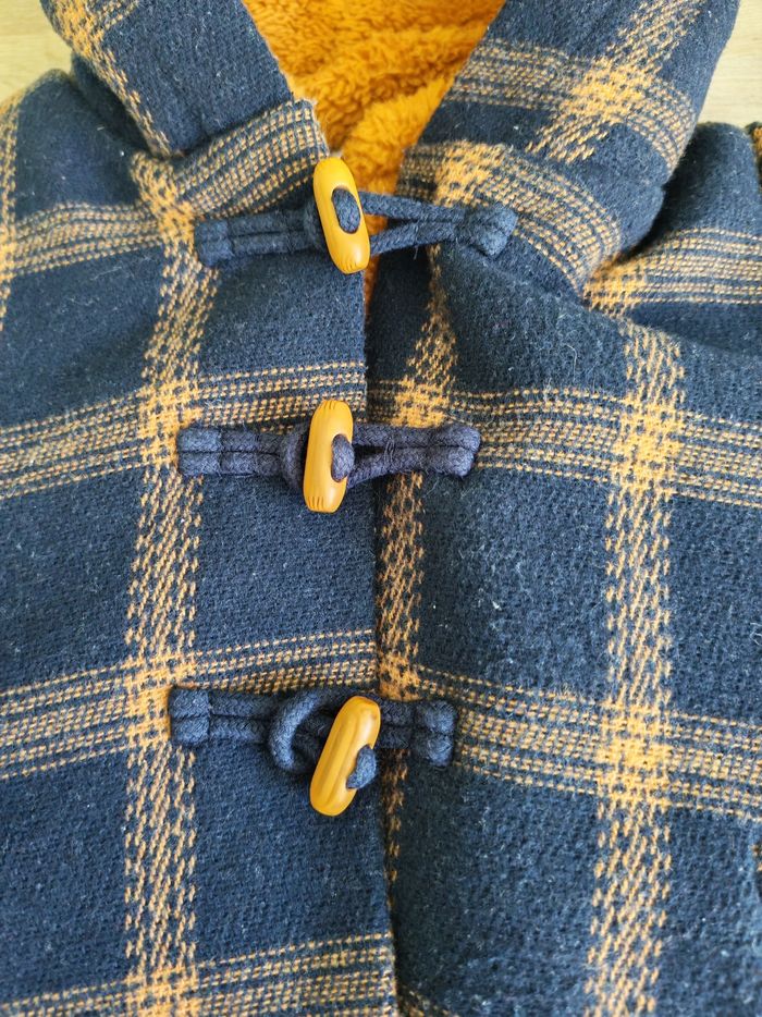 Manteau chaud style duffle-coat anglais à capuche. Tape à l'oeil, 6 mois (68 cm). Bleu marine à carreaux camel et intérieur camel. 3 boutons brandebourg et fermeture éclair sur la doublure. Fausses poches sur le devant. Élastique aux poignets. Intérieur en moumoute polaire toute douce. 76 % polyester, 23 % laine, 1 % polyamide. Doublure 100 % polyester. En très bon état, quelques peluches minimes.