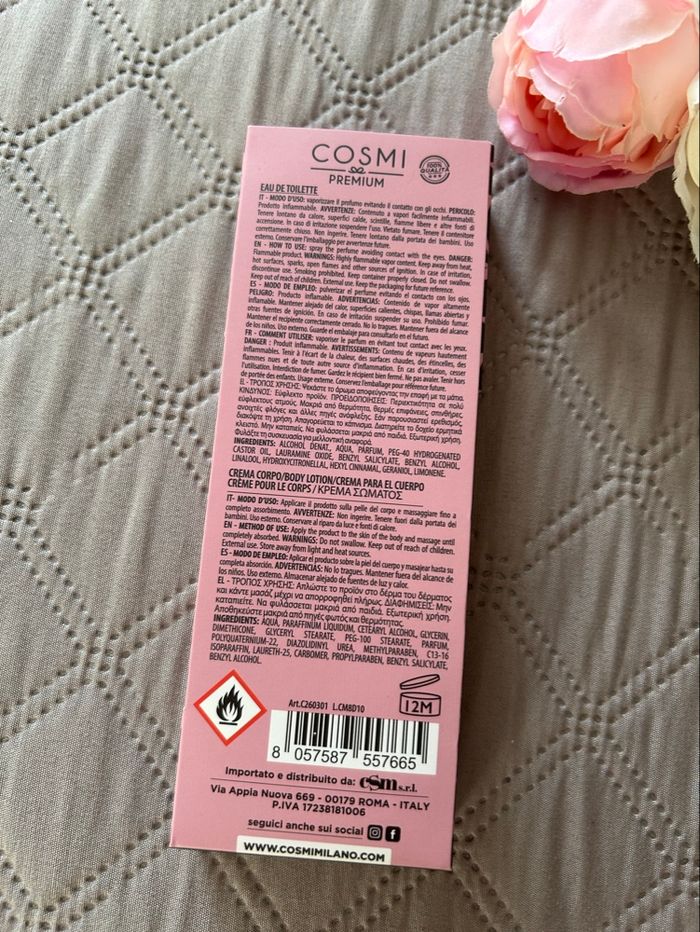 ✨Vends coffret de soin et parfum de la marque italienne Cosmi Milano, collection "Desire". Un duo parfait pour s'hydrater et se parfumer avec des notes élégantes.✨ 🔹 Le coffret contient : 1. Eau de Toilette (35 ml) : Un format spray pratique à glisser dans le sac. 2. Crème pour le corps (35 ml) : Pour une peau douce et délicatement parfumée. 🔹 État : Neuf, jamais utilisé. Le coffret est intact. 🔹 Origine : Marque italienne de qualité (Cosmi Premium). 🍃Idéal pour : Un petit cadeau, un anniversaire ou pour tester la gamme.🍃