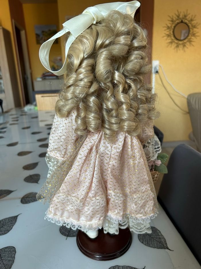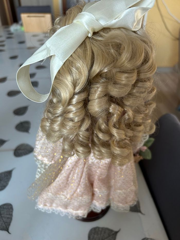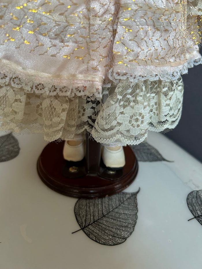 Magnifique poupée de collection d'environ 42 cm, idéale pour les amateurs de décoration romantique et printanière. Elle est vendue complète avec son petit panier d'accessoires.✨ Détails de sa tenue et de ses attributs : • Robe romantique : Tissu satiné rose poudré délicat, recouvert d'un voile de tulle orné de fines broderies dorées brillantes. • Finitions en dentelle : De nombreux détails en dentelle fleurie ornent les manches, le col et le bas du jupon, lui donnant un air très travaillé. • Accessoire charmant : Elle tient à la main un petit panier en osier rempli de fleurs artificielles (petites violettes et feuillage). • Coiffure : Une chevelure blonde bouclée volumineuse, agrémentée d'un grand ruban satiné de couleur crème à l'arrière. 🔹 Support inclus : Vendue avec son socle en bois verni pour une exposition stable et de qualité. ⚠️ Note sur l'entretien : Comme il s'agit d'un objet de décoration ayant été exposé, un peu de poussière peut être présente dans les boucles de cheveux, sur le ruban et dans les plis de la dentelle. Le tissu peut présenter une légère patine due au temps.