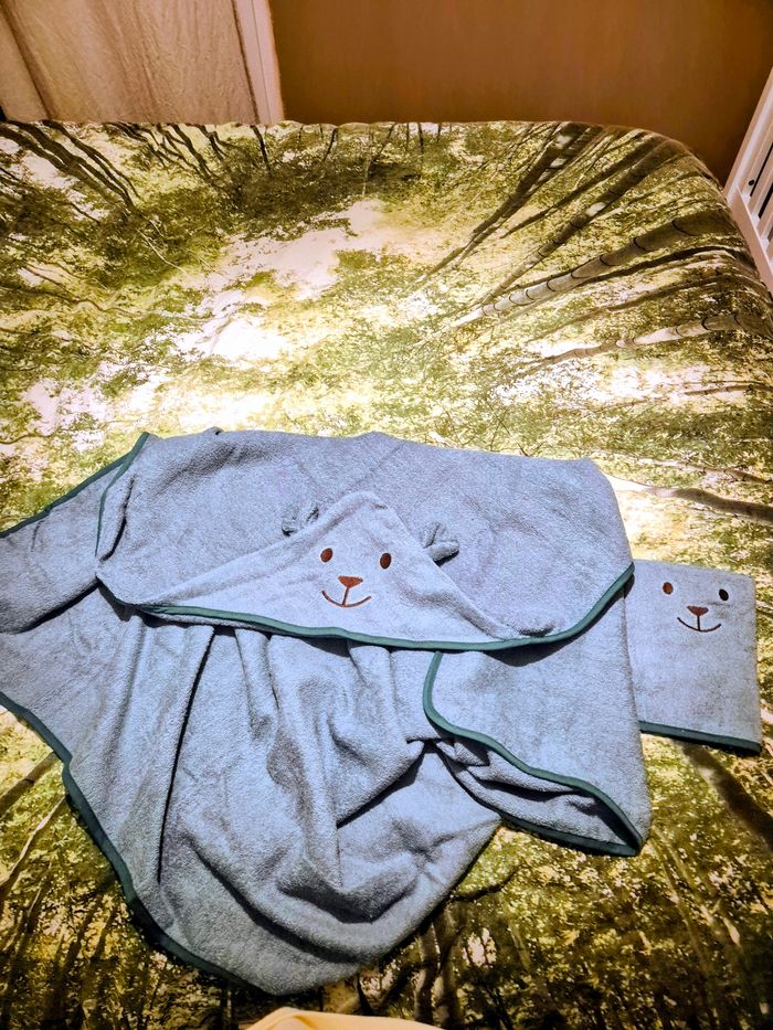 Bonjour, Je vends cet ensemble pour le bain. Cape et gant de toilette.
