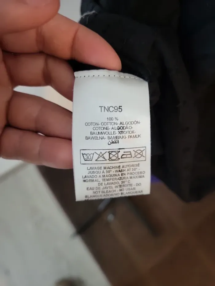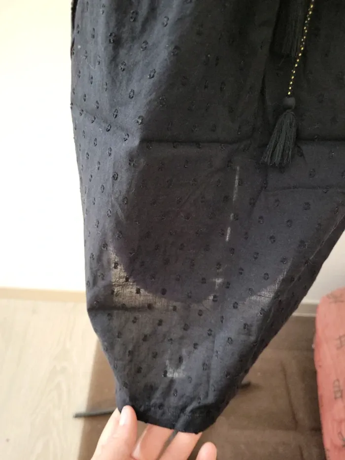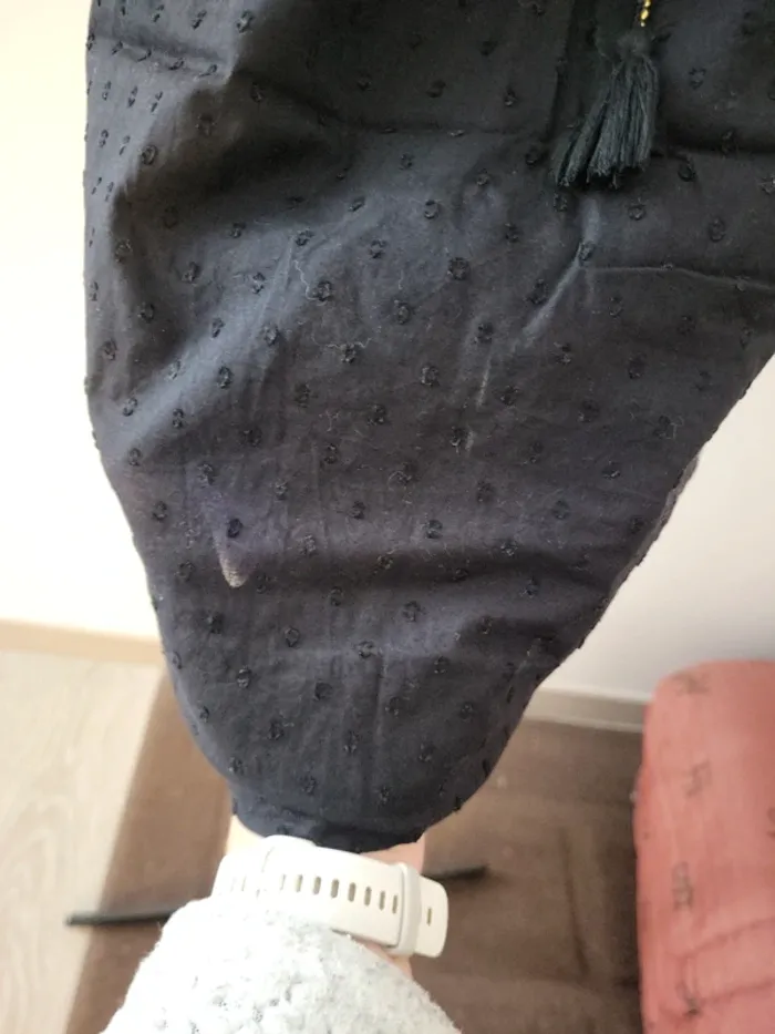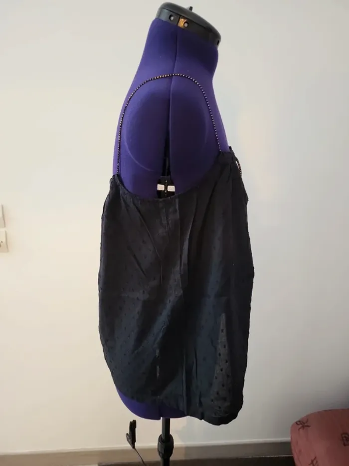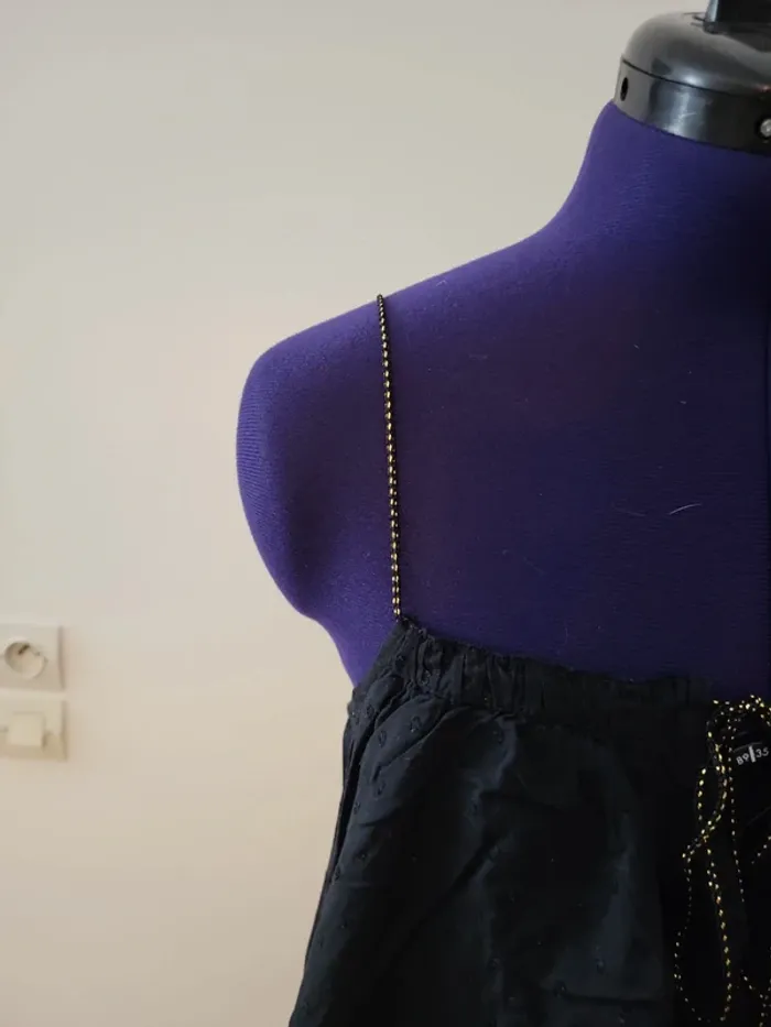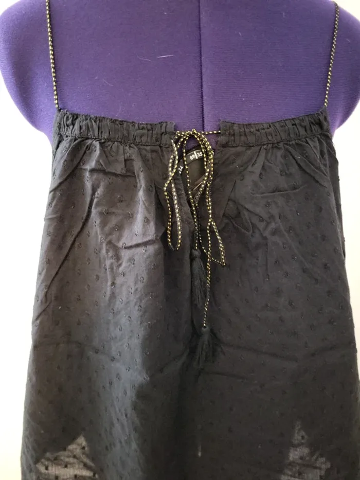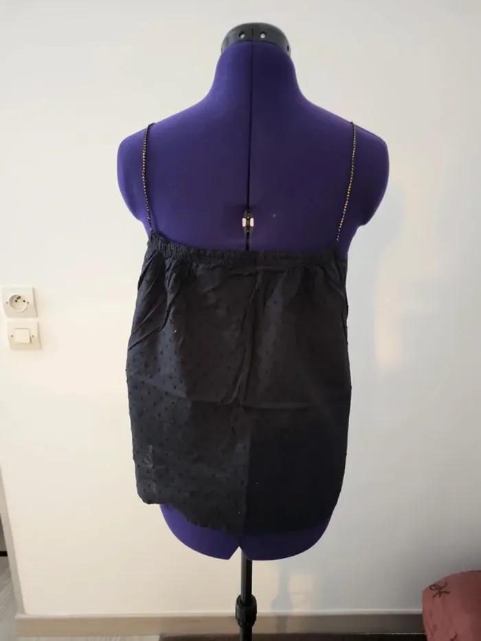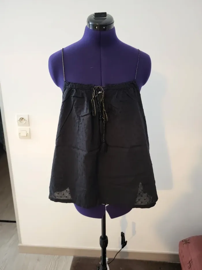 Débardeur noir fines bretelles qui se règlent avec le petit cordon doré qui se noue devant Plus d'étiquette pour la taille, la largeur aisselles varient selon comment on serre le cordon, environ XL Largeur entre aisselles : 50 cm sans serrer