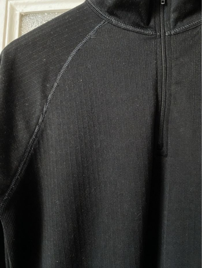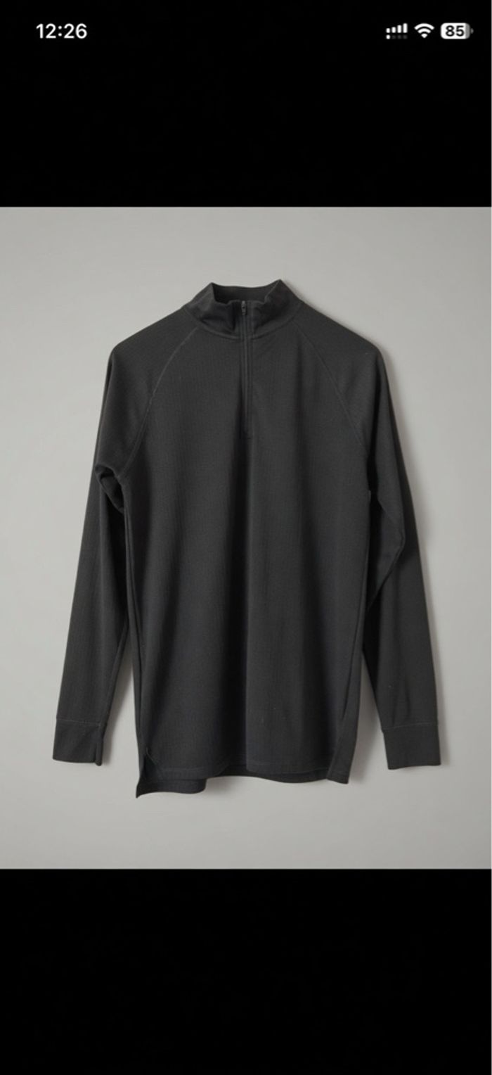 Couleur anthracite foncé (presque noir selon la lumière). Tissu technique doux et confortable, idéal pour le sport ou le quotidien. - Col montant avec zip - Coutures raglan aux épaules pour une bonne liberté de mouvement - Fentes latérales en bas pour un tombé plus fluide - Manches longues Parfait pour la mi-saison ou en layering sous une veste.