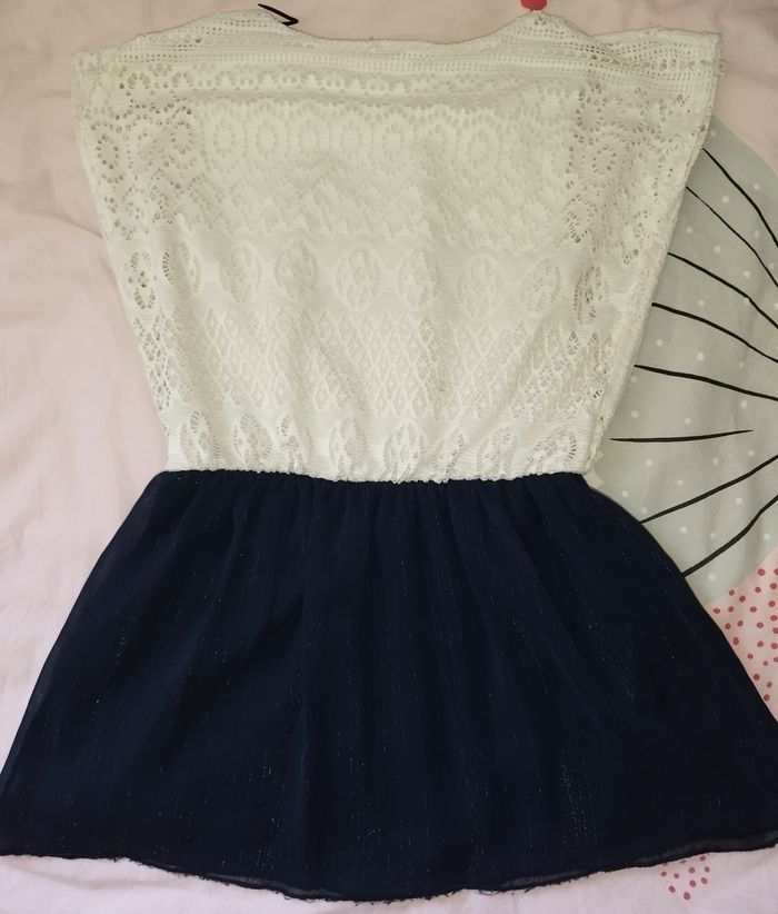 Je vends cette jolie robe pour fille de la marque Tissaia. Une pièce élégante et intemporelle, parfaite pour les occasions spéciales ou le quotidien. - Type de produit : Robe - Univers : Enfant fille - Marque : Tissaia - Taille : 6 ans / 116 cm - Couleur : Blanc et bleu marine - Caractéristiques : Haut en dentelle blanche, jupe plissée bleu marine, manches courtes N'hésitez pas à me contacter pour plus d'informations ou de photos.