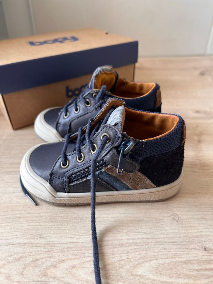 Chaussures premiers pas de la marque BOPY. Bleu marine taille 21. Elles se ferment avec une fermeture. Prix d’achat : 64.99€
