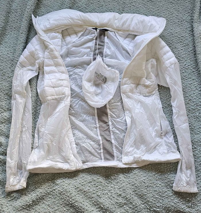 Blouson / veste matelassée The North Face pour femme, couleur blanc, très bon état et très peu porté. Avec petite pochette The North Face pratique pour ranger ou transporter le blouson. Parfait pour un look casual, urbain ou pour les sorties en plein air Confortable, chaud et beau.