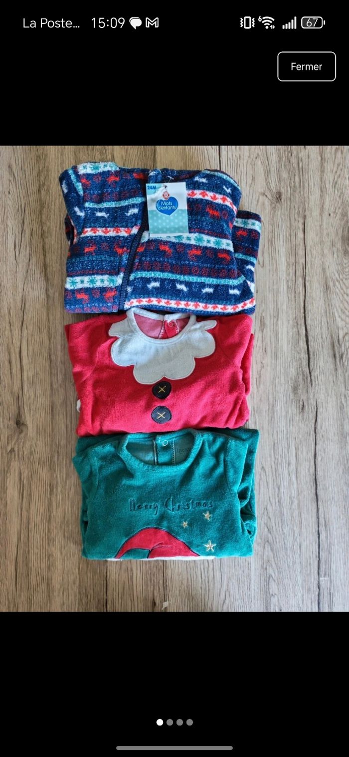 Bonjour, Je vends un lot de 3 pyjamas Noël, dont un avec étiquette. Très bon état. Taille 12 mois