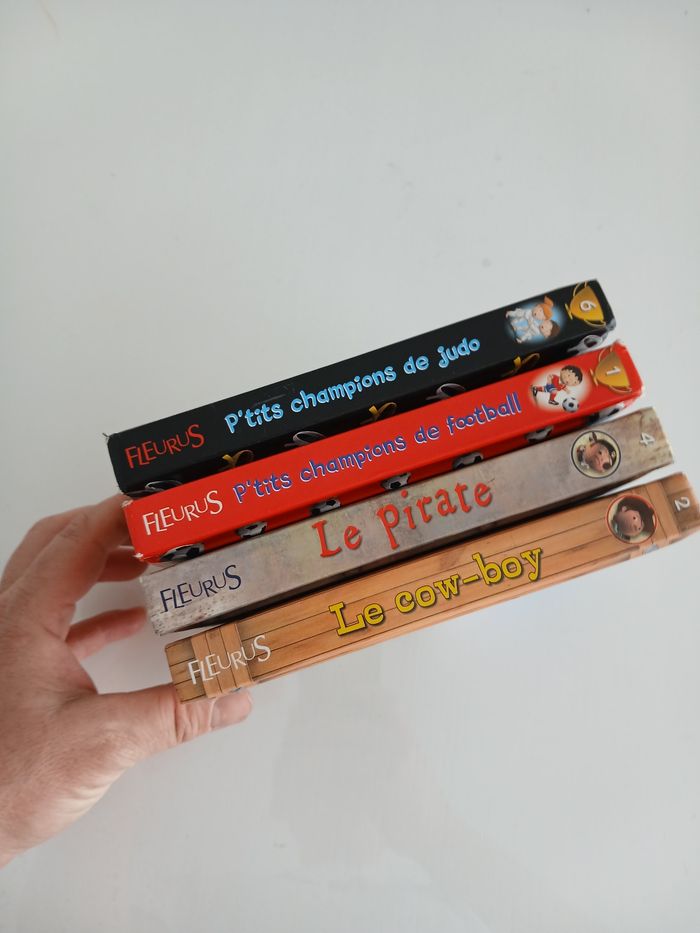 État : Bon état Prix : 8 € ​Description : Vends un lot de 4 livres cartonnés pour enfants des éditions Fleurus, parfaits pour l'éveil et l'imagination des plus petits. Les pages sont épaisses et robustes, adaptées aux petites mains. ​Le lot comprend : ​Collection P'tit héros : * Le pirate ​Le cow-boy ​Collection P'tits champions : * P'tits champions de judo ​P'tits champions de football ​Détails complémentaires : ​État : Bon état général. Les couvertures et les tranches présentent quelques marques d'usage léger (voir photos), mais l'intérieur est propre et parfaitement lisible. ​Prix du lot : 8 €