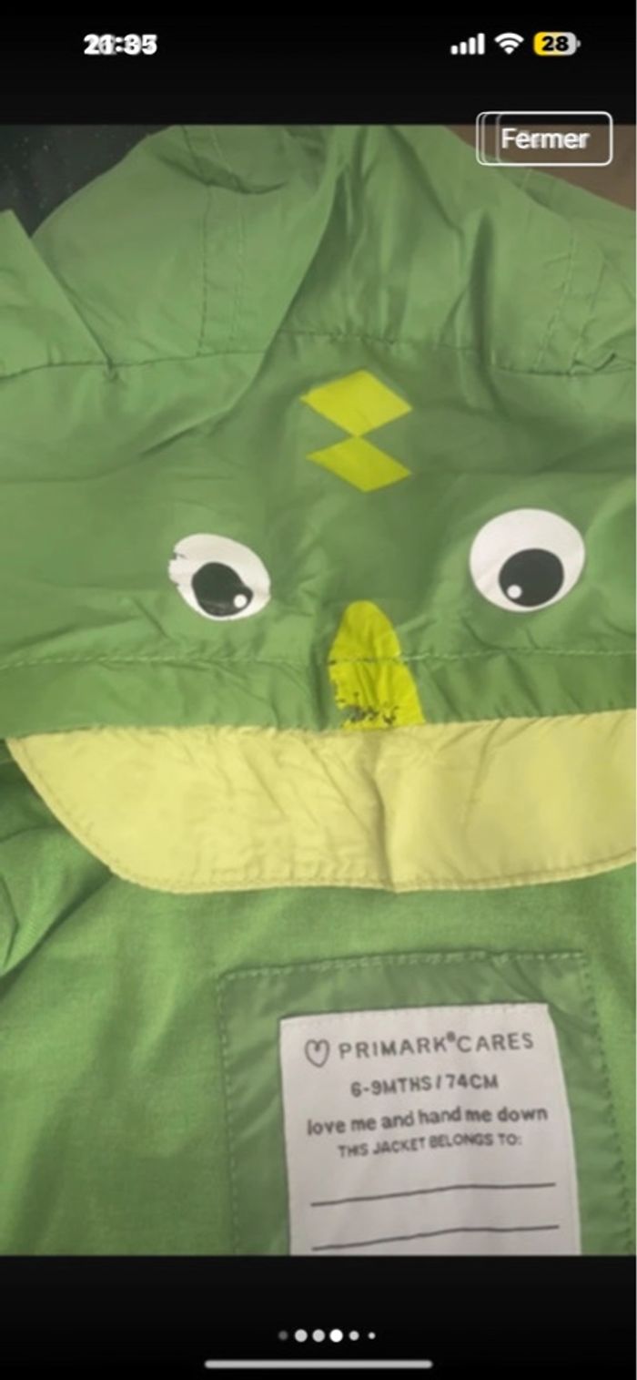 Blouson imperméable Primark taille 6/9 mois neuf avec étiquette Se plie comme un kway Petit défaut au niveau du dessin de la capuche