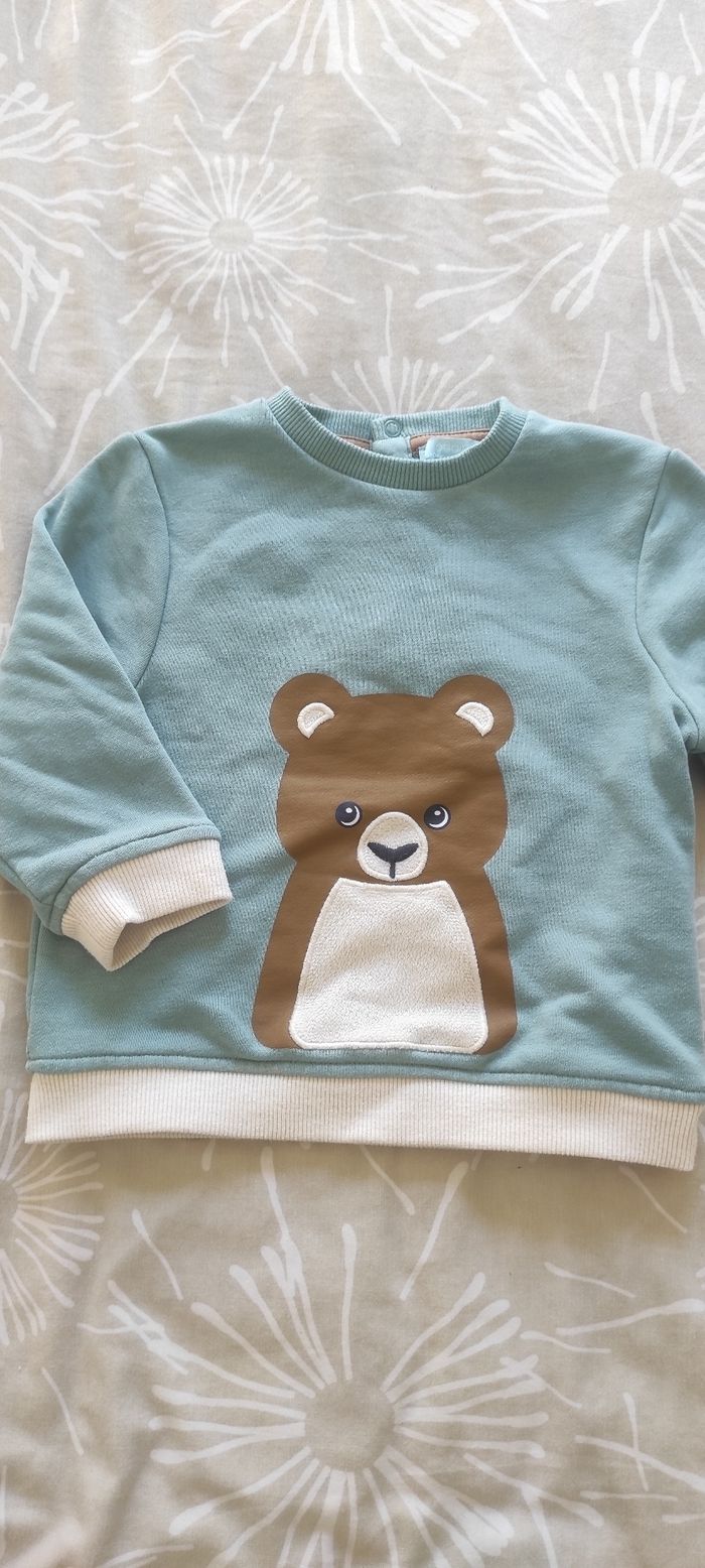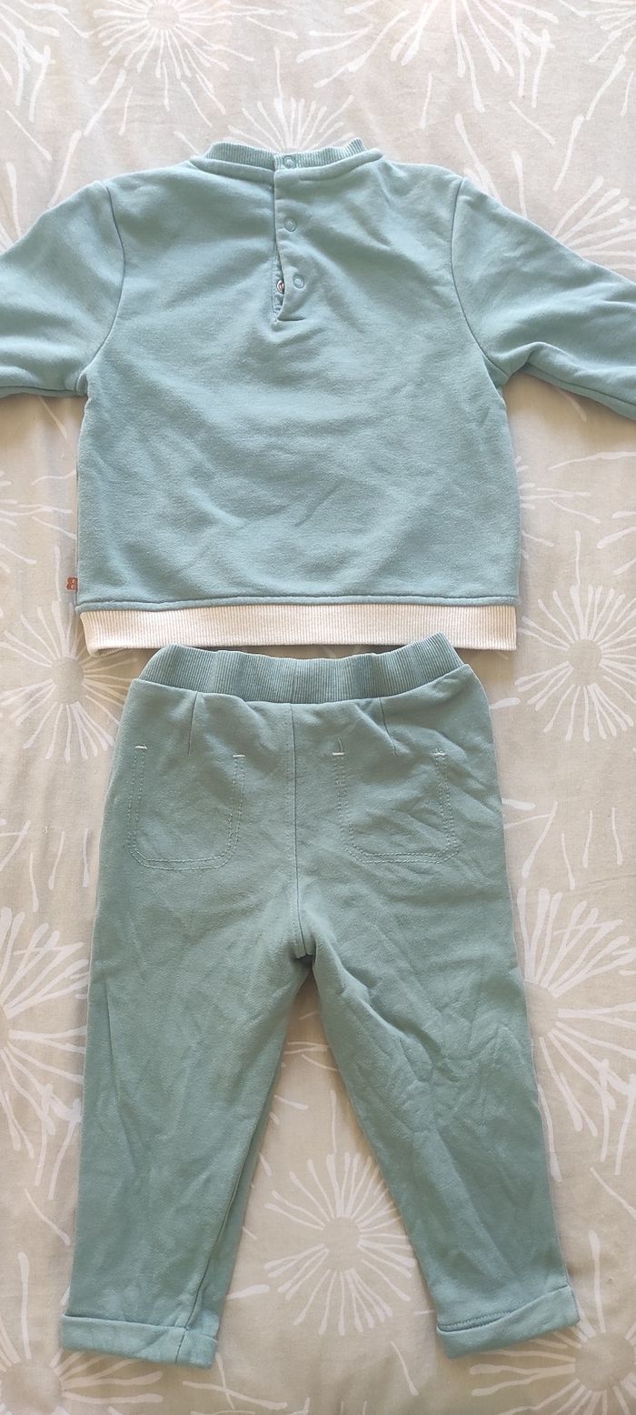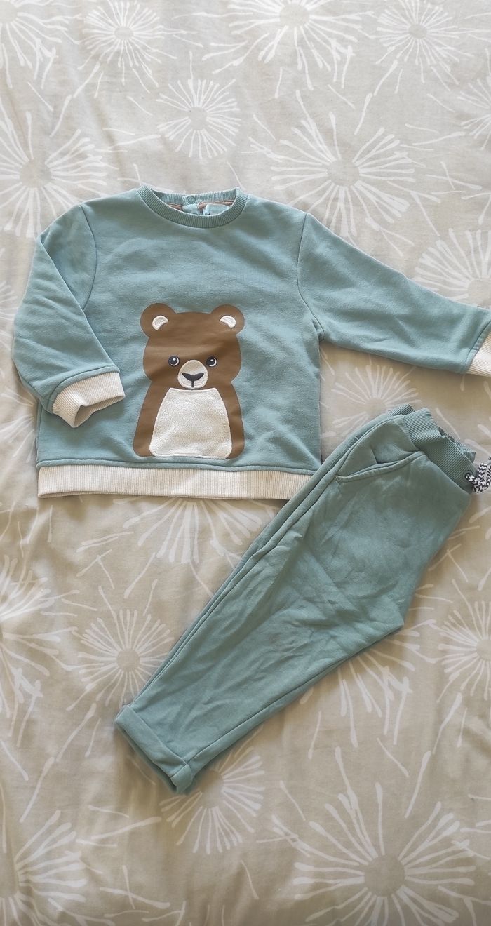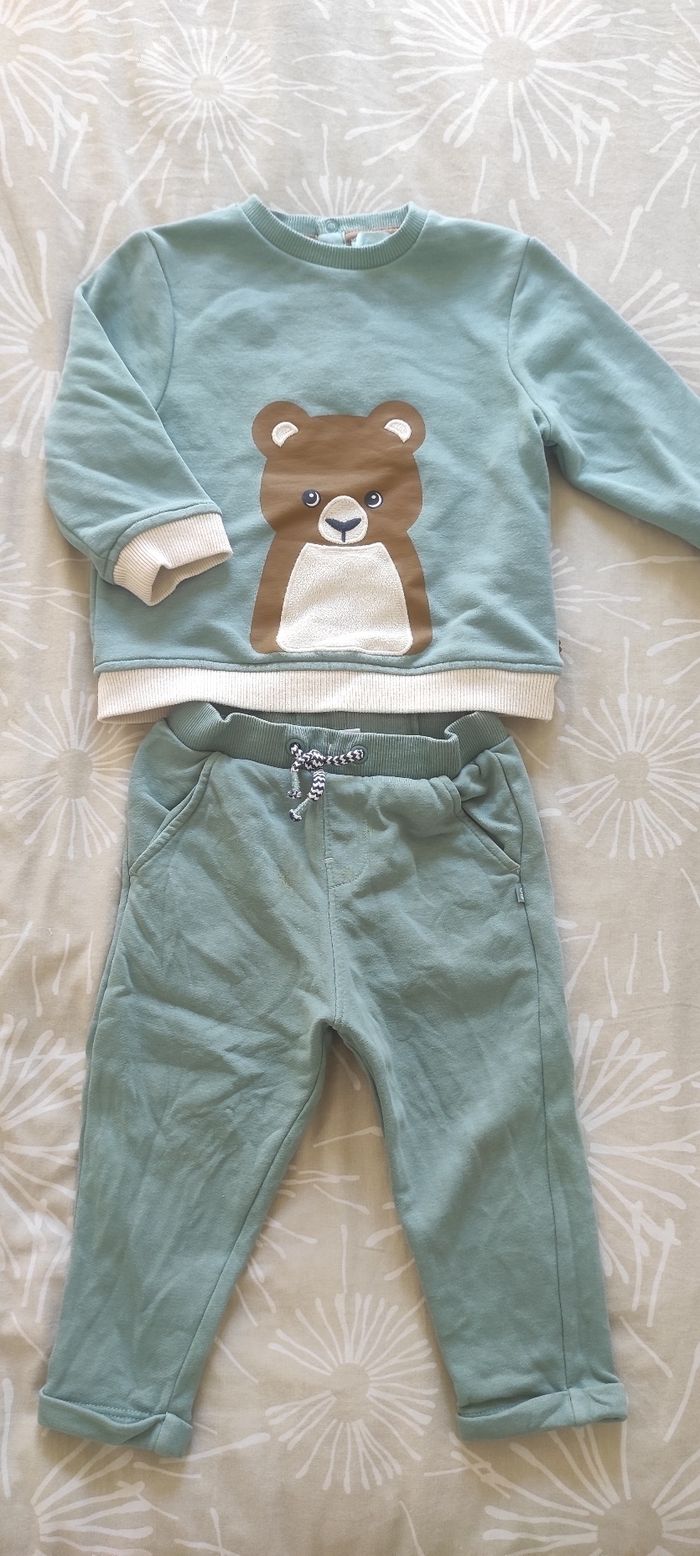 Ensemble haut et pantalon Haut style sweat léger vert avec ours (pressions au dos) Bas style jogging vert , réglable à l'intérieur de la taille Okaïdi 24 mois Très bon état général (le nom de mon fils est encore sur l'étiquette) Pensez aux lots : réductions activées