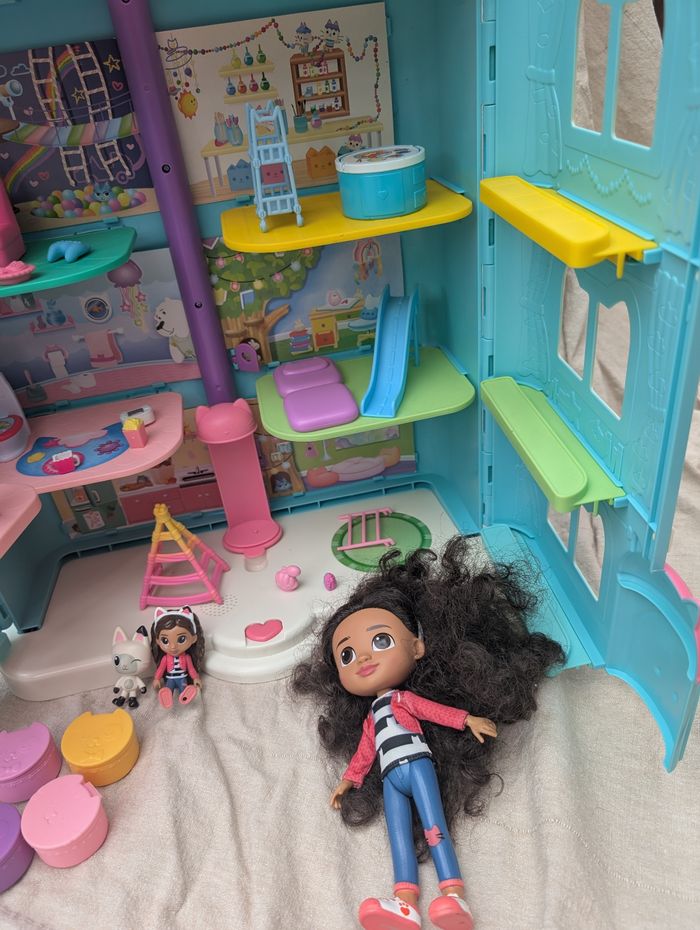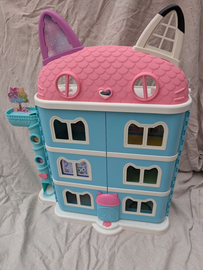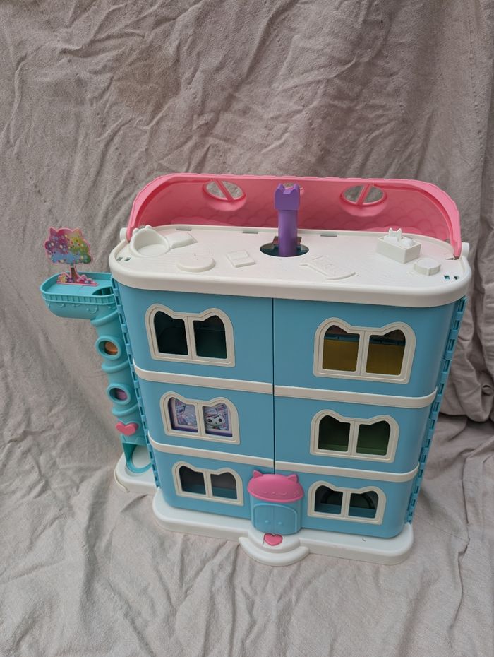 Bonjour Je vends cette maison gabby chat avec une figurine Gabby, pandichat et des accessoires (voir photos), ainsi que plusieurs boîtes surprises et la chambre de Marine (mais sans la figurine de Marine). Il y a également une petite poupée Gabby. Le bouton son est enfoncé et ne fonctionne pas mais il doit être possible de le réparer.