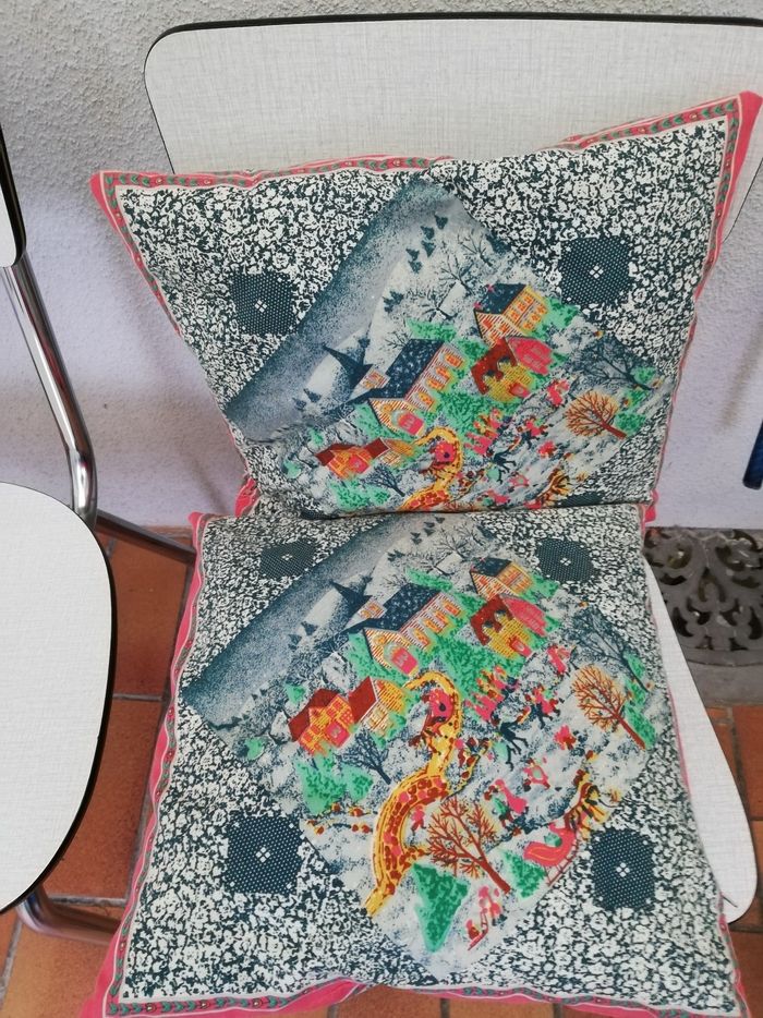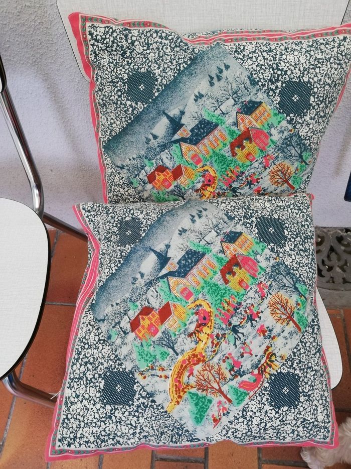 2 Coussins décoration village de chaque côté des coussins même déco, largeur 35cm au carré, déhoussables, très bon état, peuvent être vendus séparément à 3 € piece.