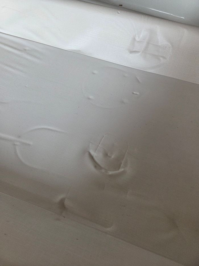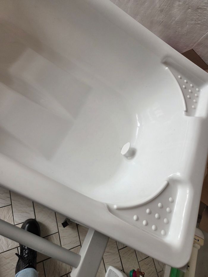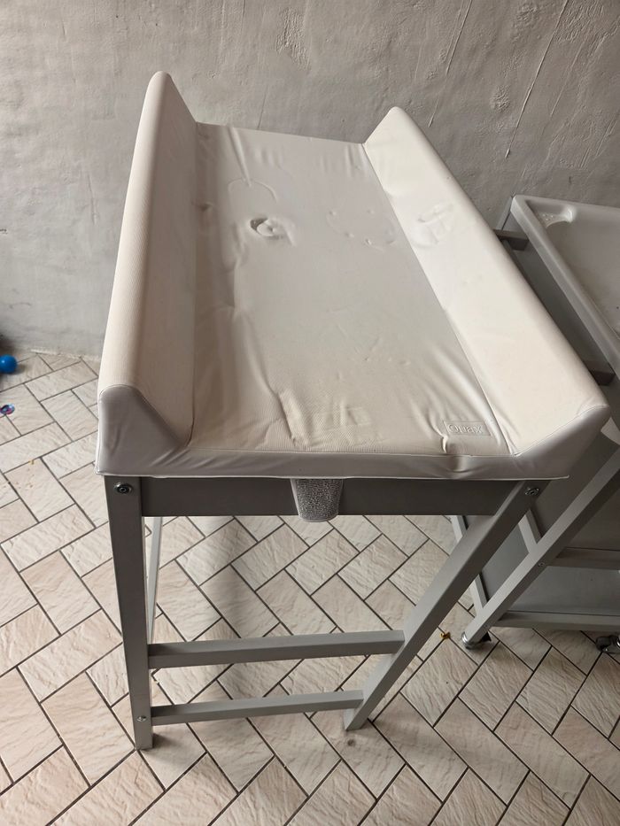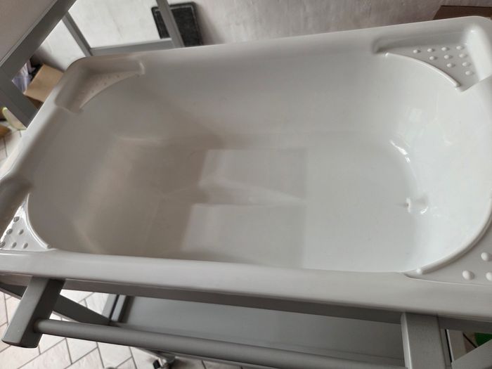 Baignoire avec table à langer il manque le tuyau et alors comme vous pouvez le voir nous avons posé des choses sur le matelas à langer et ça a donc fait des marques je dois regarder s'il y a encore les marques car je venais de retirer les objets au moment de la photo.