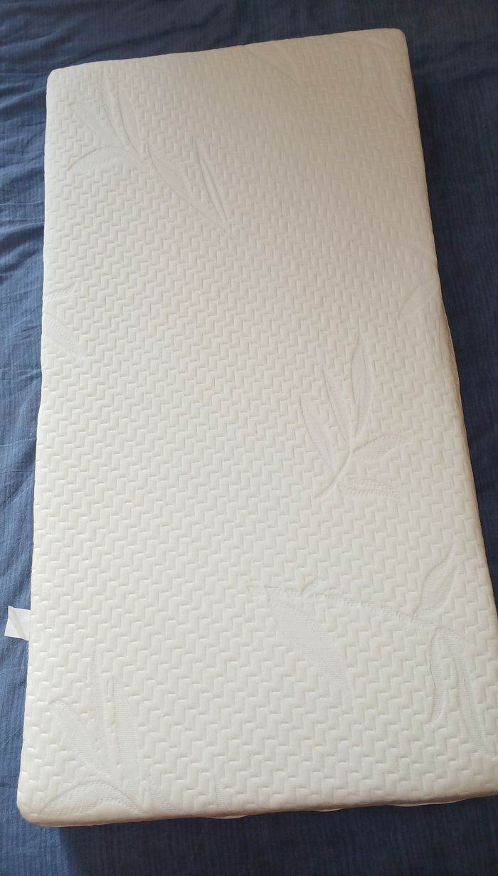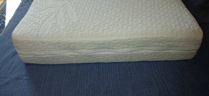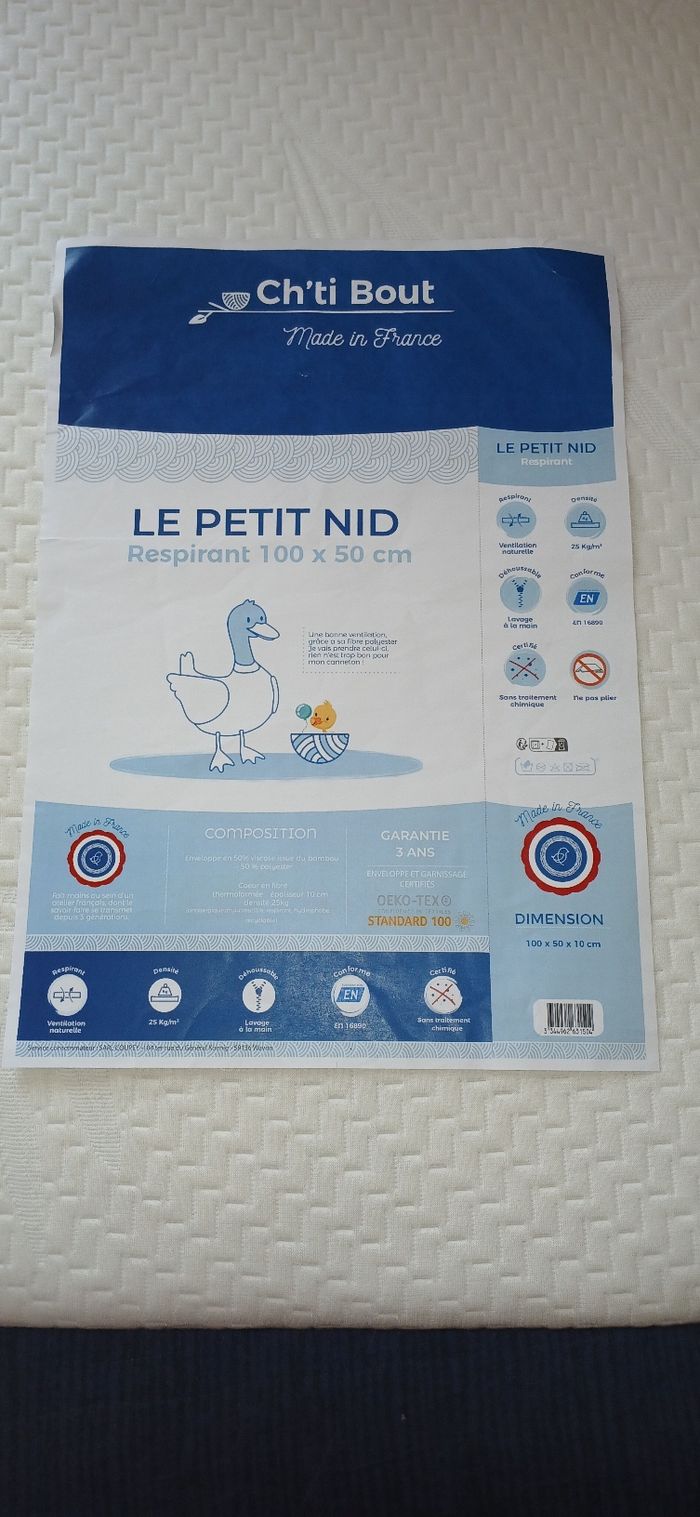MMatelas bébé 100 x 50 x 10 Respirant Made in France. Densité 25kg/m³ Enveloppe en bambou déhoussable . Sans traitement chimique. Conforme EN 16890. Encore sous garantie acheté en juillet 2025,utilisé 4 mois (bébé né en octobre) ,nous avons changé de lit. Très bon état comme neuf,toujours utilisé avec une protection !