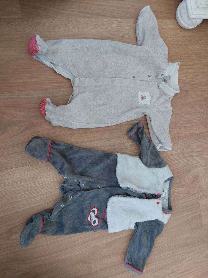 2 pyjamas velours 1 beige Petit bateau 1 gris avec gilet blanc Obaibi
