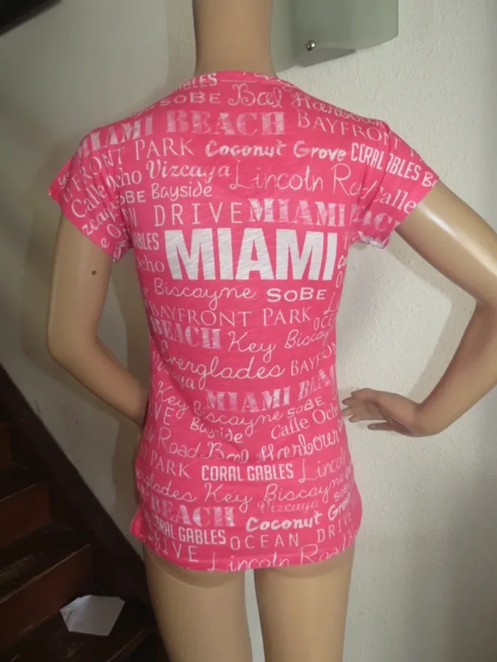 Je vends ce t-shirt femme rose fuchsia avec motifs texte "Miami" et lieux emblématiques. Un vêtement léger et coloré, parfait pour un look casual et dynamique. - Type de produit : T-shirt - Univers : Femme - Taille : S (36) - Couleur : Rose / Fuchsia - Caractéristiques : Manches courtes, Col V, Motifs texte imprimés N'hésitez pas à me contacter pour plus d'informations ou de photos.