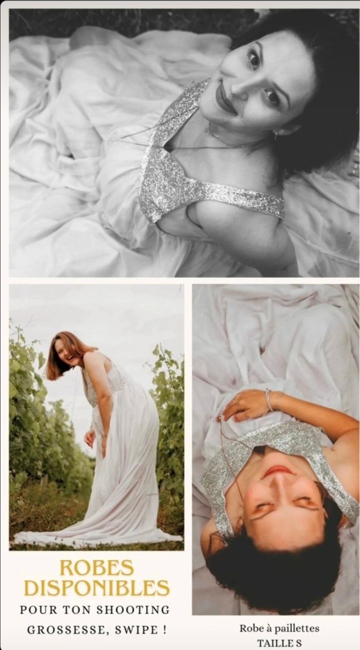 Utilisée lors de shootings grossesses. Très bon etat, tulle et paillettes sur le haut. Blanche et paillettes argentées. Taille M