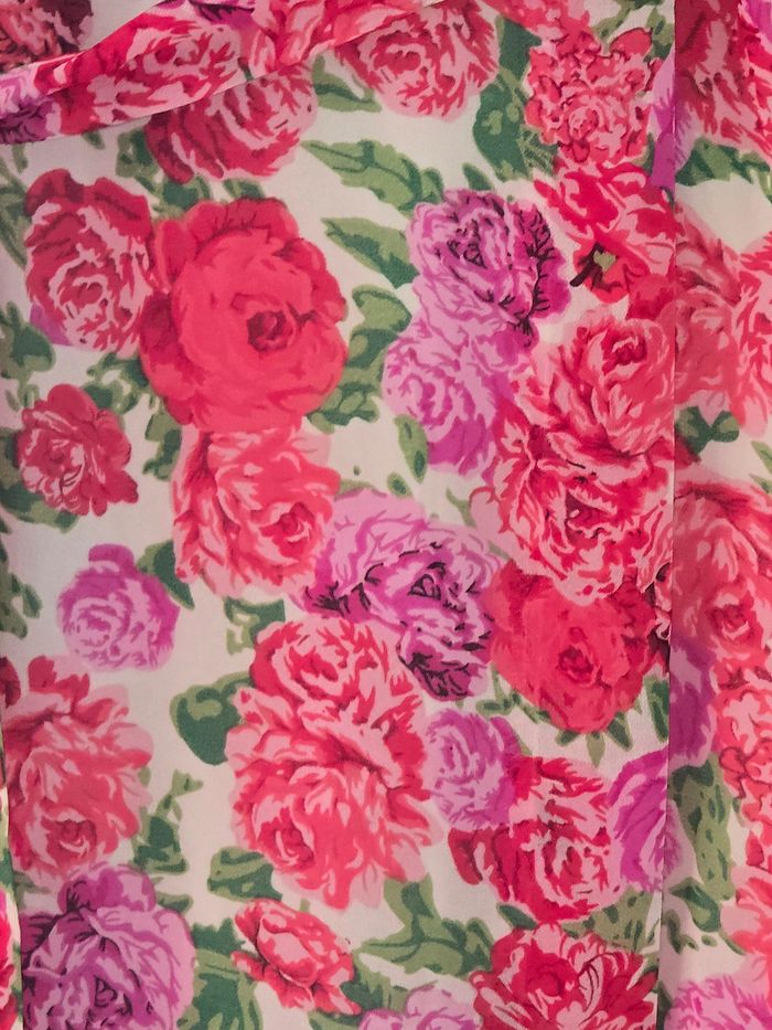Très jolie robe longue en "portefeuille". Fermeture par ceinture. Voilage imprimé fleuri avec doublure. Très légère pour l'été. Magnifique ❤️ Malheureusement, devenue trop juste pour moi.