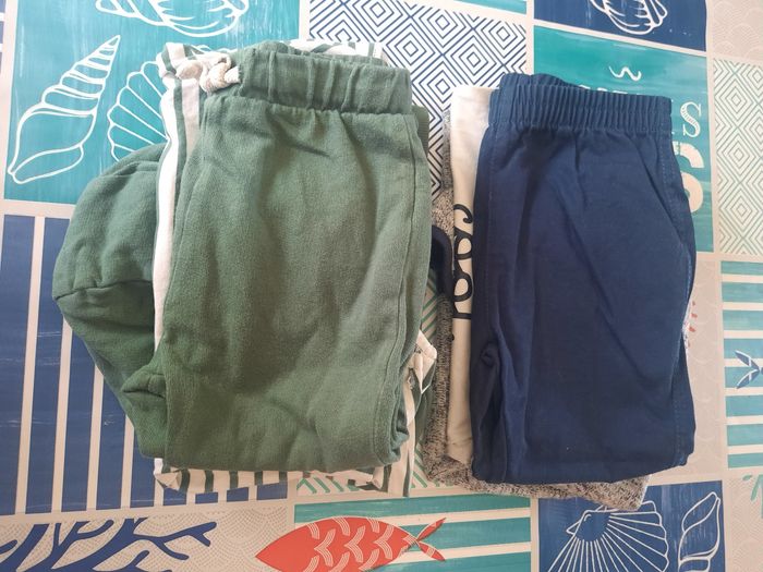 1 ensemble 3 pièces Kiabi en 24 mois avec pantalon de jogging, t-shirt ML et veste à capuche 1 ensemble 3 pièces Carrefour en 23 mois avec pantalon fin bleu marine, t-shirt ML et veste à capuche
