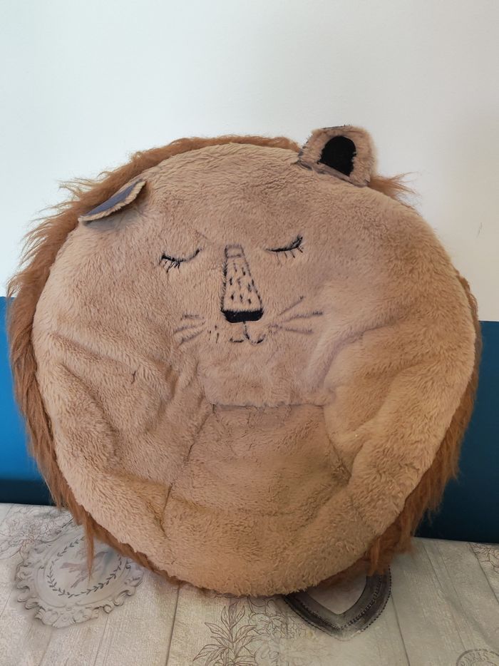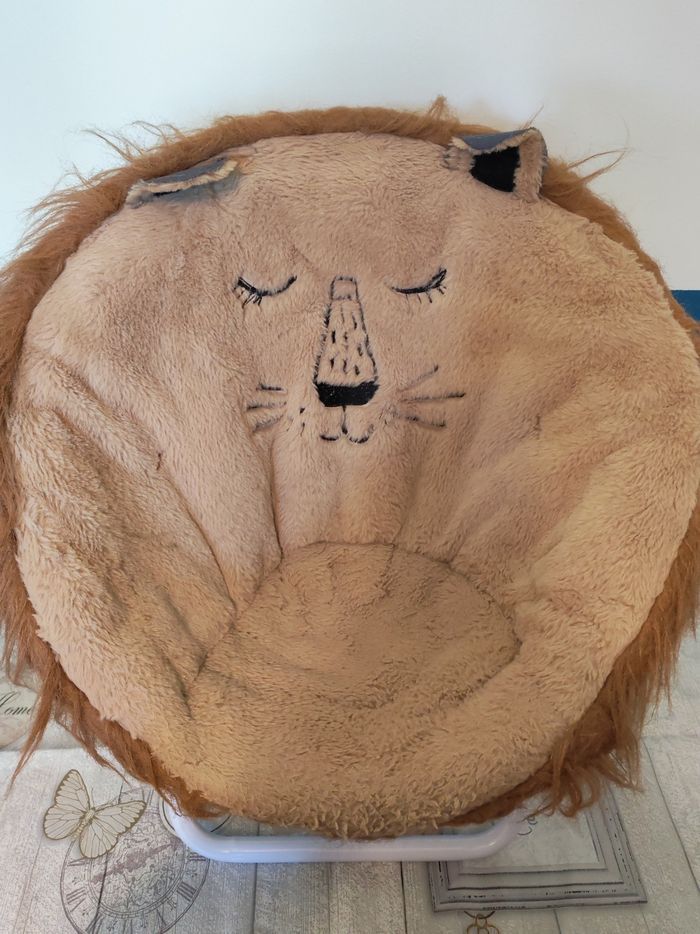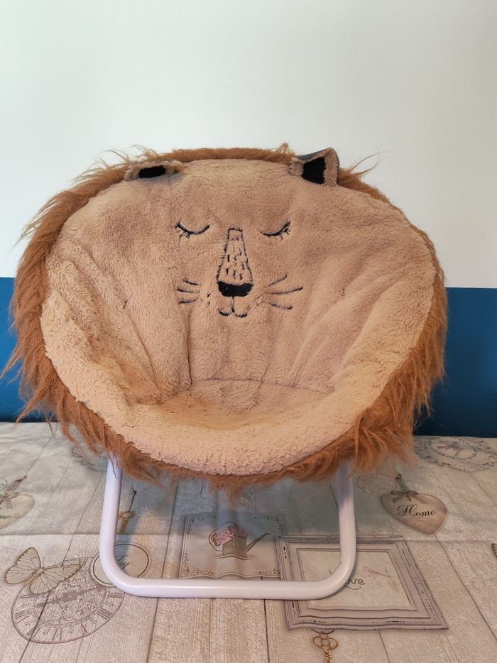 Fauteille pliant Enfant lion, de couleurs beige et criniaire marron Hauteur 50cm, largueur 50cm Hauteur assise 26 cm. Prend tres peu de place plier. De marque atmosphera. En tres bon etat