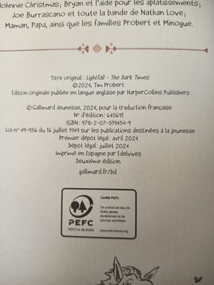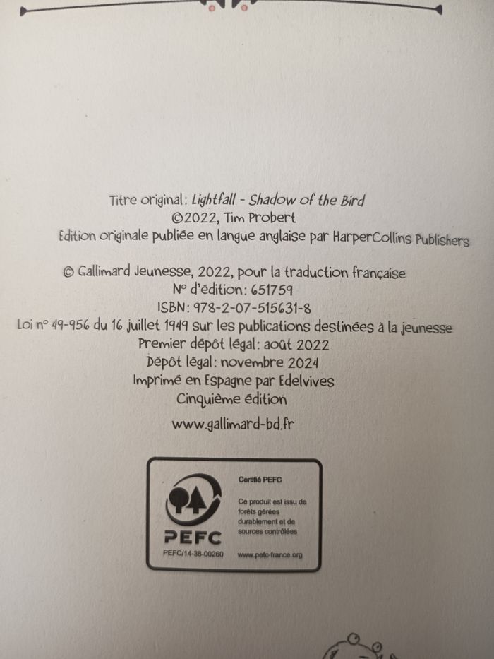 ⚠️ lot indissociable 🚚 expédition exclusivement par stop to shop. 🛒 Également disponible sur mon compte beebs by kiabi qui fait régulièrement des réductions sur vos commandes 👤 Auteur / Illustrateur Tim Probert 🏢 Éditeur Gallimard Jeunesse (BD) 🗣️ Langue Français (traduction) 🔤 Conjugaisons Présent de narration • Imparfait • Passé composé 💡 Notions abordées Aventure • Quête initiatique • Amitié • Courage • Peur • Responsabilité • Monde imaginaire • Créatures • Enjeux collectifs 🎓 Cible pédagogique (cycles + classes + âges) Cycle 3 - CM1 — 9–10 ans - CM2 — 10–11 ans - 6e — 11–12 ans Cycle 4 - 5e — 12–13 ans Compétences travaillées Lecture suivie • Compréhension fine • Inférences • Analyse de personnages • Codes de la BD • Construction d’un univers fictionnel 📏 Dimensions (communes aux 3 ouvrages) 23,8 cm (H) × 16 cm (L) × 2,5 cm (ép.) --- 📘 TOME 1 🇫🇷 Lightfall : La Dernière Flamme 🇬🇧 Lightfall – The Girl & the Galdurian - Année d’édition française : 2021 - ISBN : 978‑2‑07‑515259‑4 - Nombre de pages : 256 - premier dépôt légal mars 2021 - dépôt légal juin 2024 - Impression : Espagne, Edelvives - 12e édition --- 📙 TOME 2 🇫🇷 Lightfall : L’Ombre de l’Oiseau 🇬🇧 Lightfall – Shadow of the Bird - Année d’édition française : 2022 - ISBN : 978‑2‑07‑515631‑8 - Édition : Cinquième édition - Nombre de pages : 250 - premier dépôt légal aout 2022 - dépôt légal novembre 2024 - Impression : Espagne, Edelvives --- 📕 TOME 3 🇫🇷 Lightfall : Le Temps des Ténèbres 🇬🇧 Lightfall – The Dark Times - Année d’édition française : 2024 - ISBN : 978‑2‑07‑519454‑9 - Édition : Deuxième édition - Nombre de pages : 244 - premier dépôt légal : avril 2024 - dépôt légal juillet 2024 - Impression : Espagne, Edelvives ---
