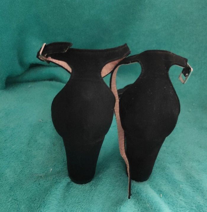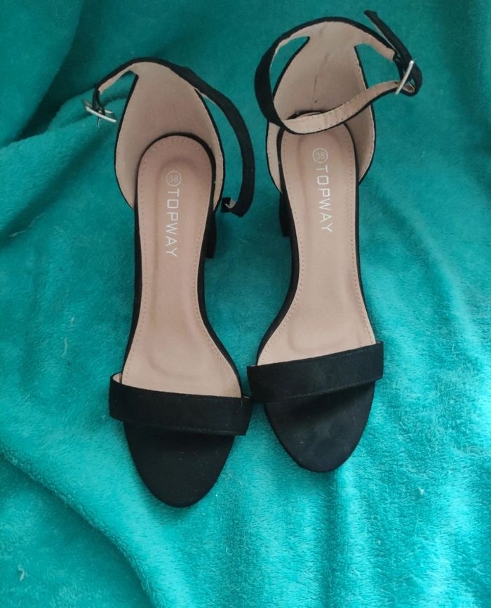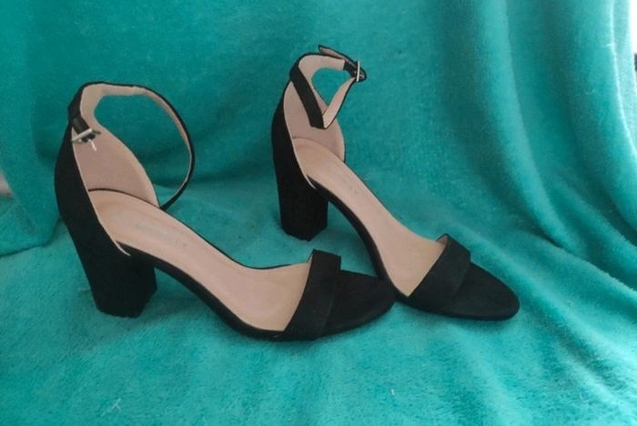Sandales à talons noires. Jamais portées. Sangles à la cheville. Talons : 8 cm