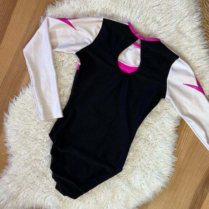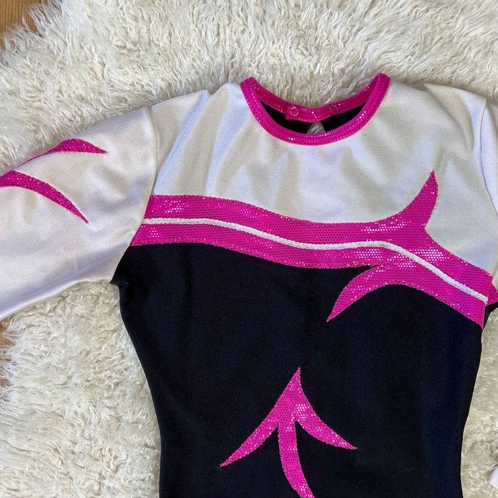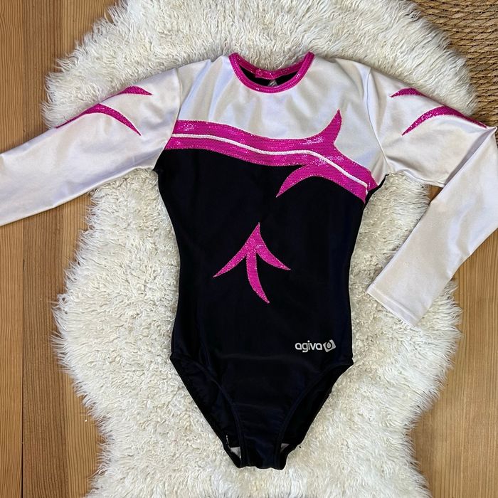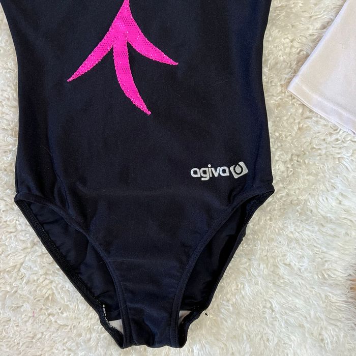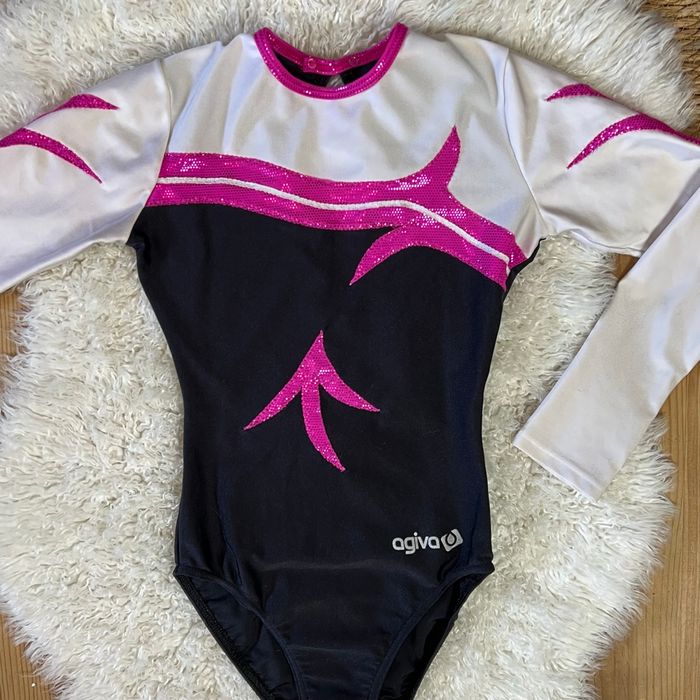 Magnifique justaucorps gymnastique Agiva - Type de produit : Justaucorps - Marque : Agiva - Couleur : Noir, rose brillant et blanc - Taille : 10 ans Excellent état, très peu porté.