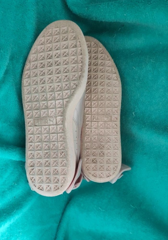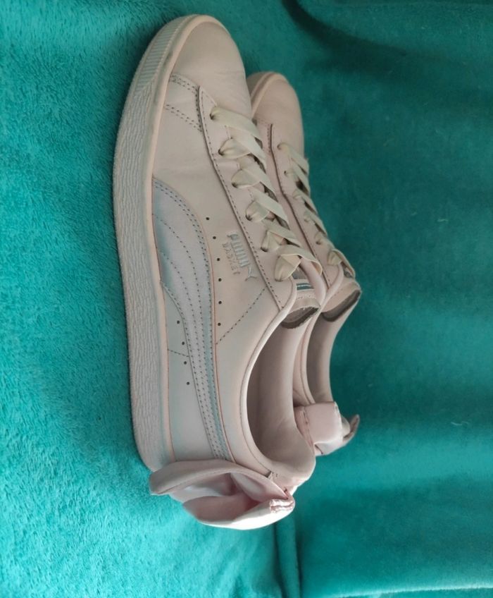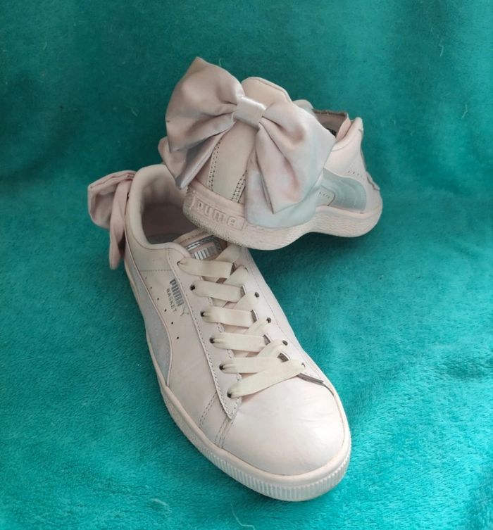 Paire de puma avec noeud à l'arrière. Très bon état. (Manque un élastique à l'intérieur voir photo mais ne gêne en rien le port de la chaussure) Les lacets sont élastique Très peu portées N'hésitez pas pour plus de photos
