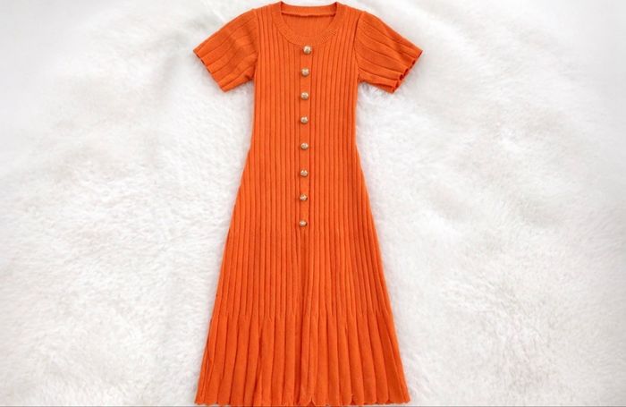 🧡 Robe orange côtelée – coupe midi élégante Superbe robe orange vive en maille côtelée, qui met bien en valeur la silhouette. Coupe midi avec manches courtes et boutons décoratifs sur le devant pour une touche chic. Matière extensible, confortable et agréable à porter. ✨ Style : féminine & tendance ✨ Couleur : orange vif ✨ Longueur : midi ✨ Détails : maille côtelée, boutons dorés, manches courtes ✨ Coupe : ajustée