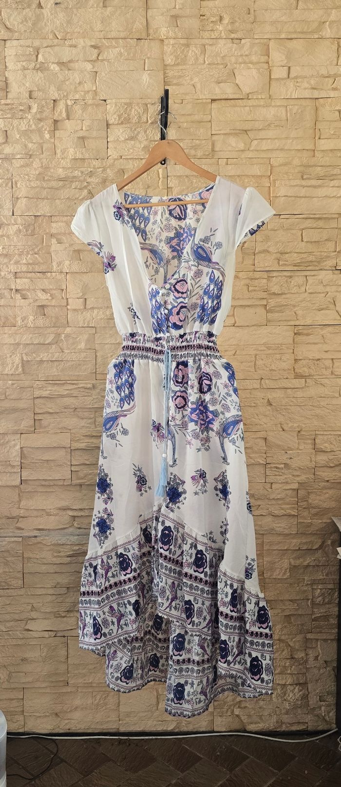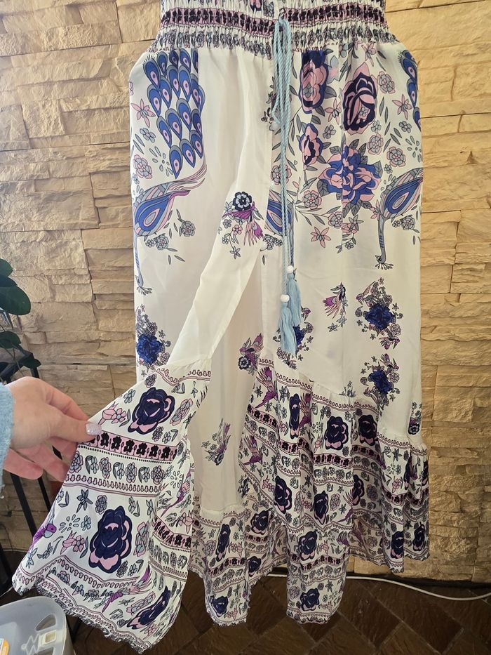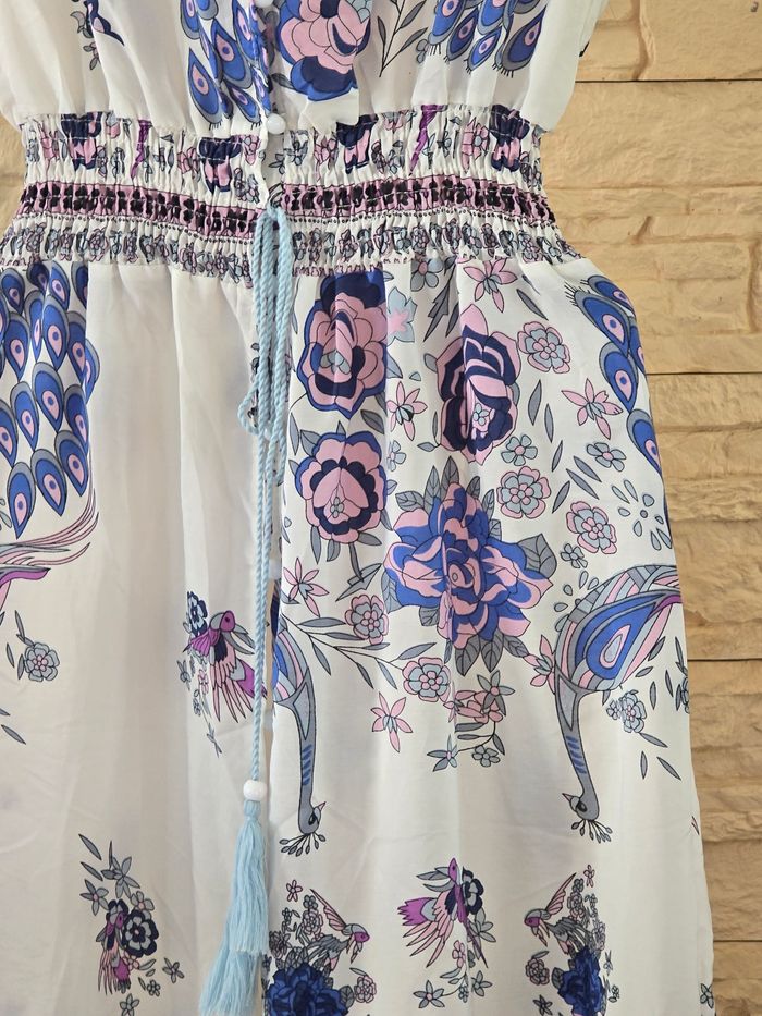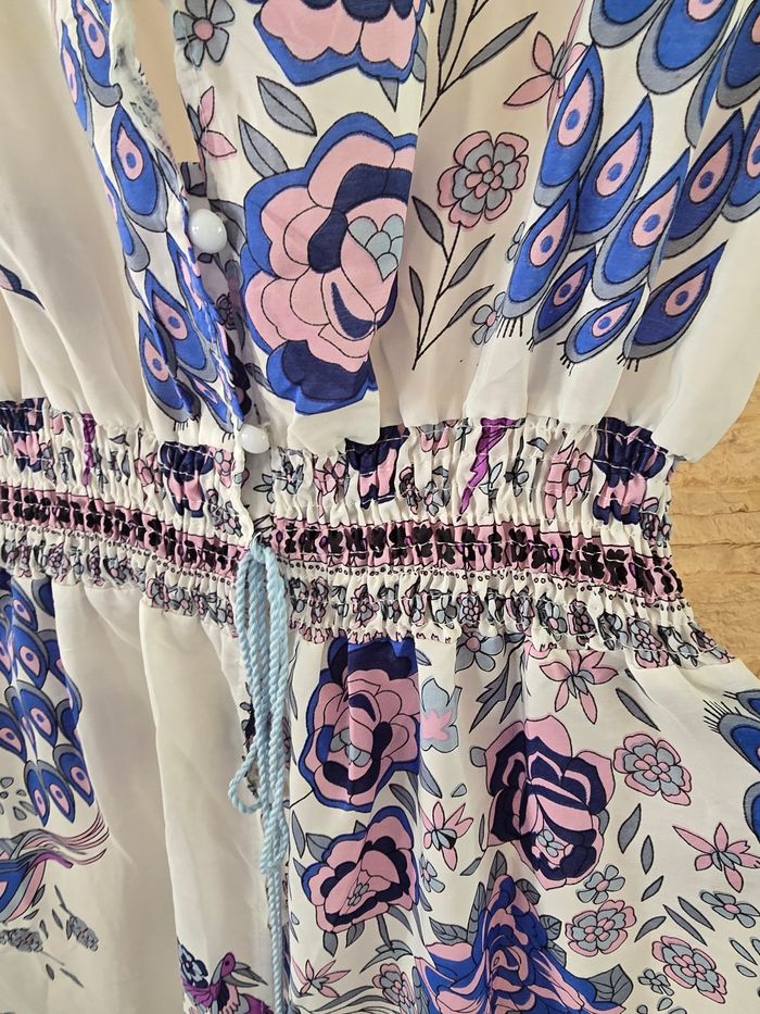 Robe plus courte devant que derrière A porter avec quelques chose en dessous car transparente. Très légère. Idéal pour la plage ou la piscine au dessus d'un maillot de bain. Pas d'étiquette, je ne sais absolument plus où j'ai trouvé cette robe