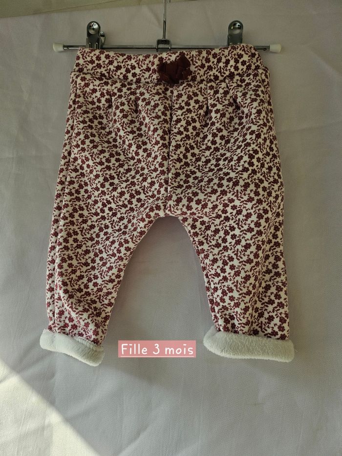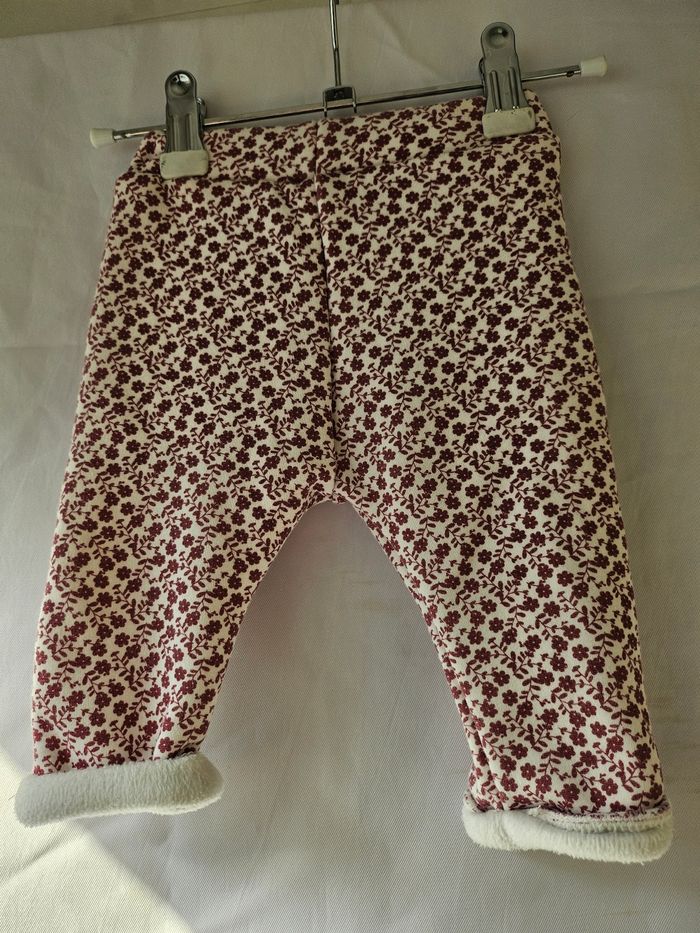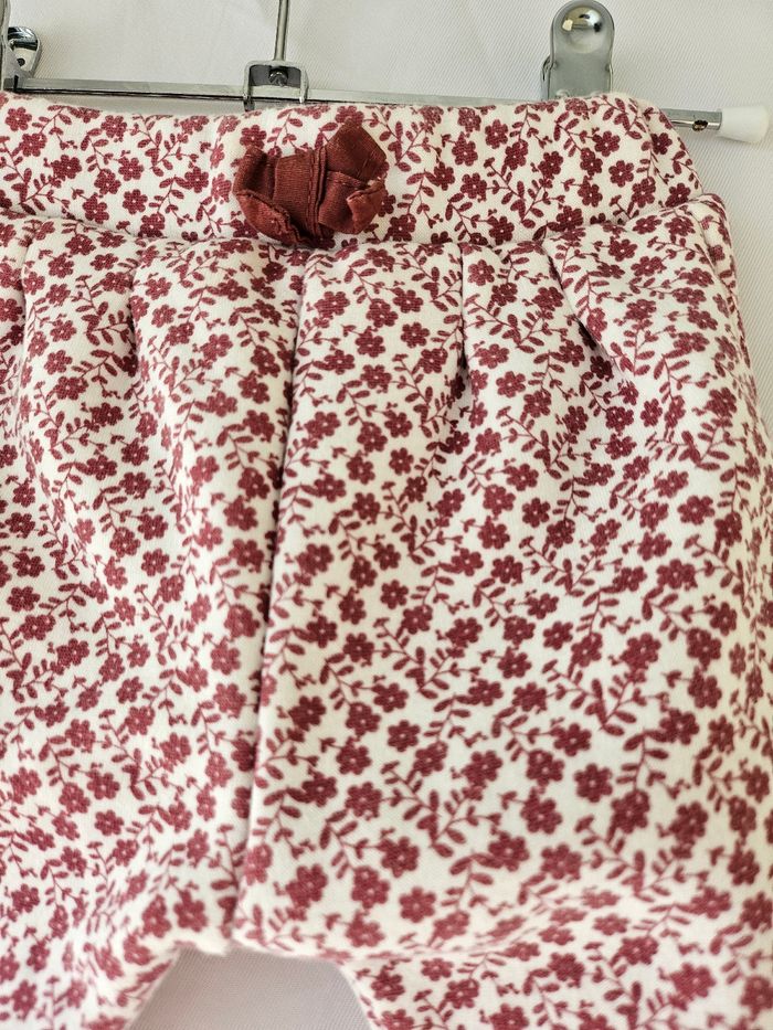 Jogging blanc avec imprimés florales bordeaux. Noeud décoratif à la taille. Petit ourlet blanc. Marque : Fashion Private Company Taille : 3 mois