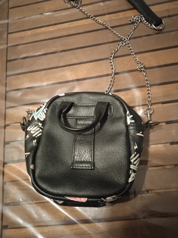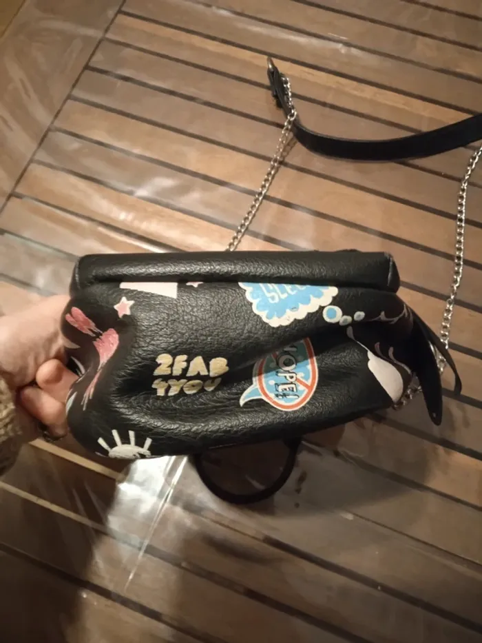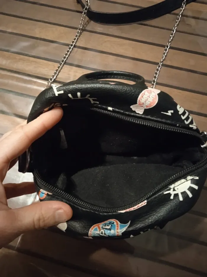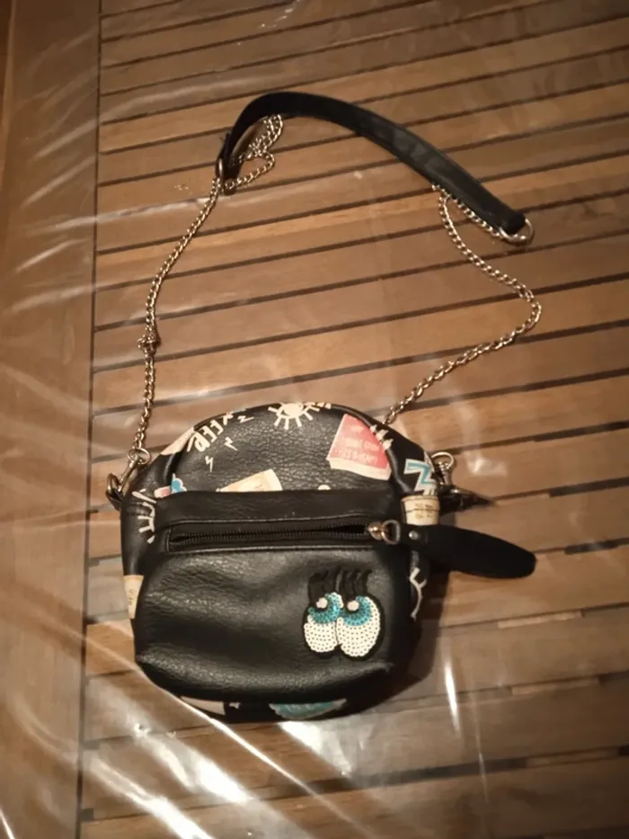 petite sacoche en bandoulière avec chaine sac à main noir avec motifs emoji un peu street rock'n'roll petite poche devant avec yeux en strass dimensions 15cm*15cm marque CLAIRE'S bien servi, bon état général, pas de trous, peut encore resservir, juste les dessins ont perdu un peu de leur couleur vive Sympa pour une jeune fille ado