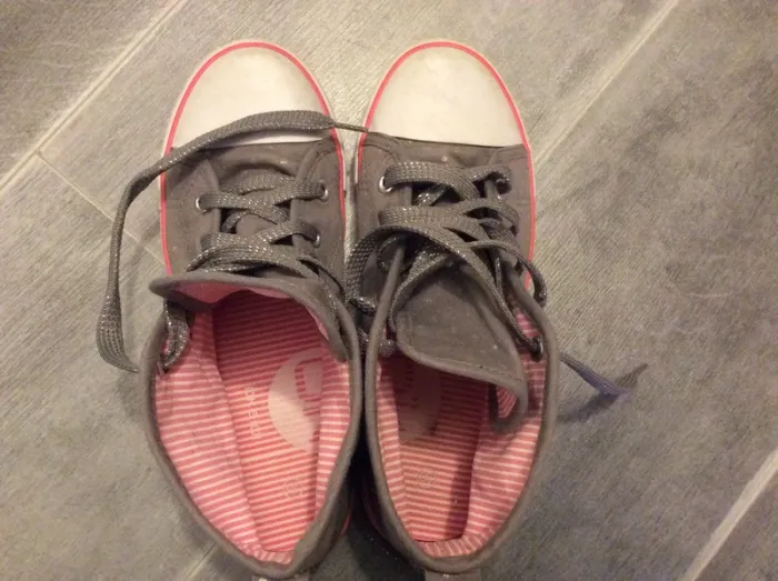 Baskets montantes en toile pour filles de marque Okaïdi Grise avec des étoiles argentées et bandes roses Taille 36 Très peu portées